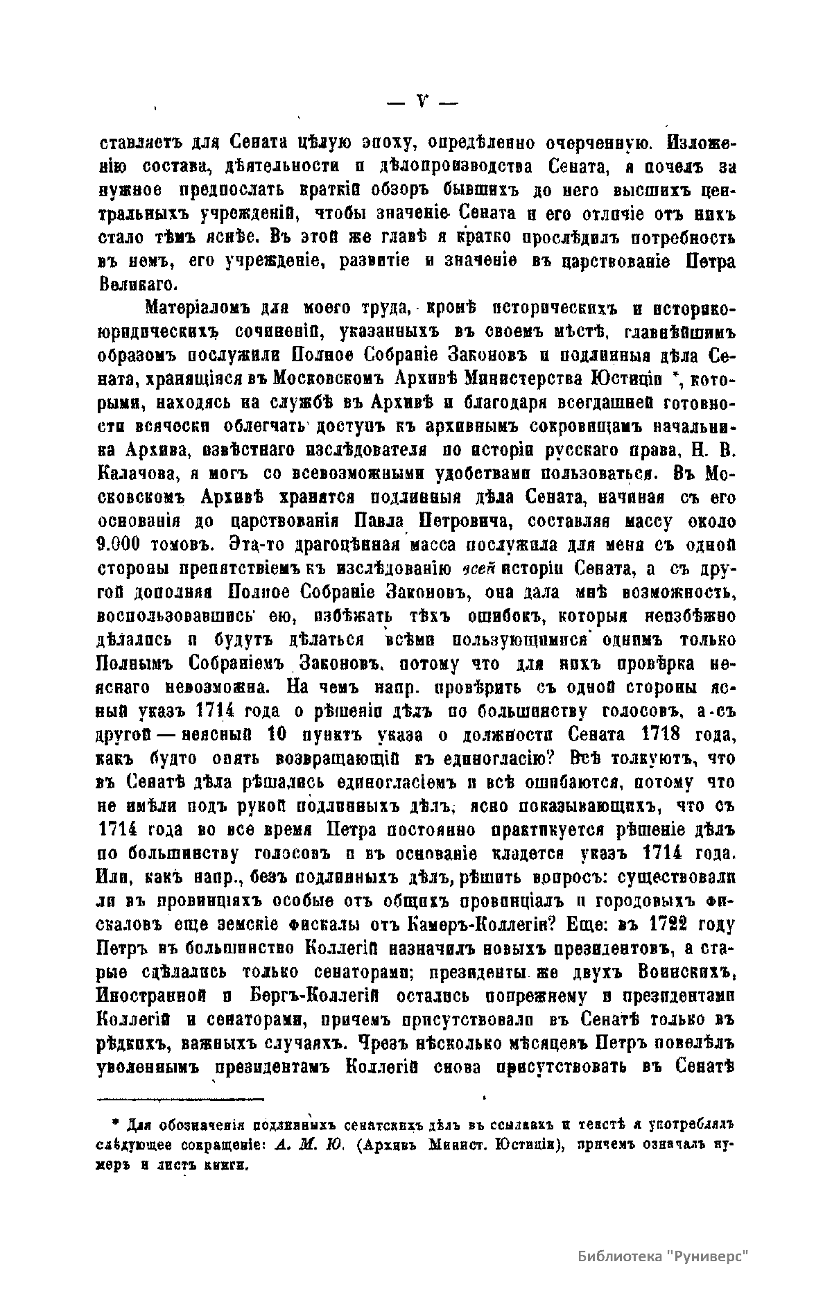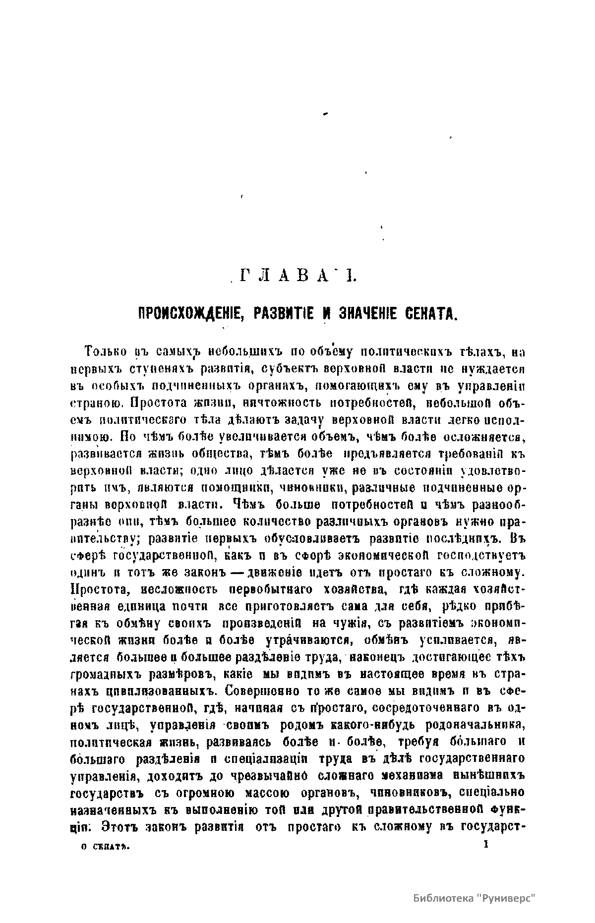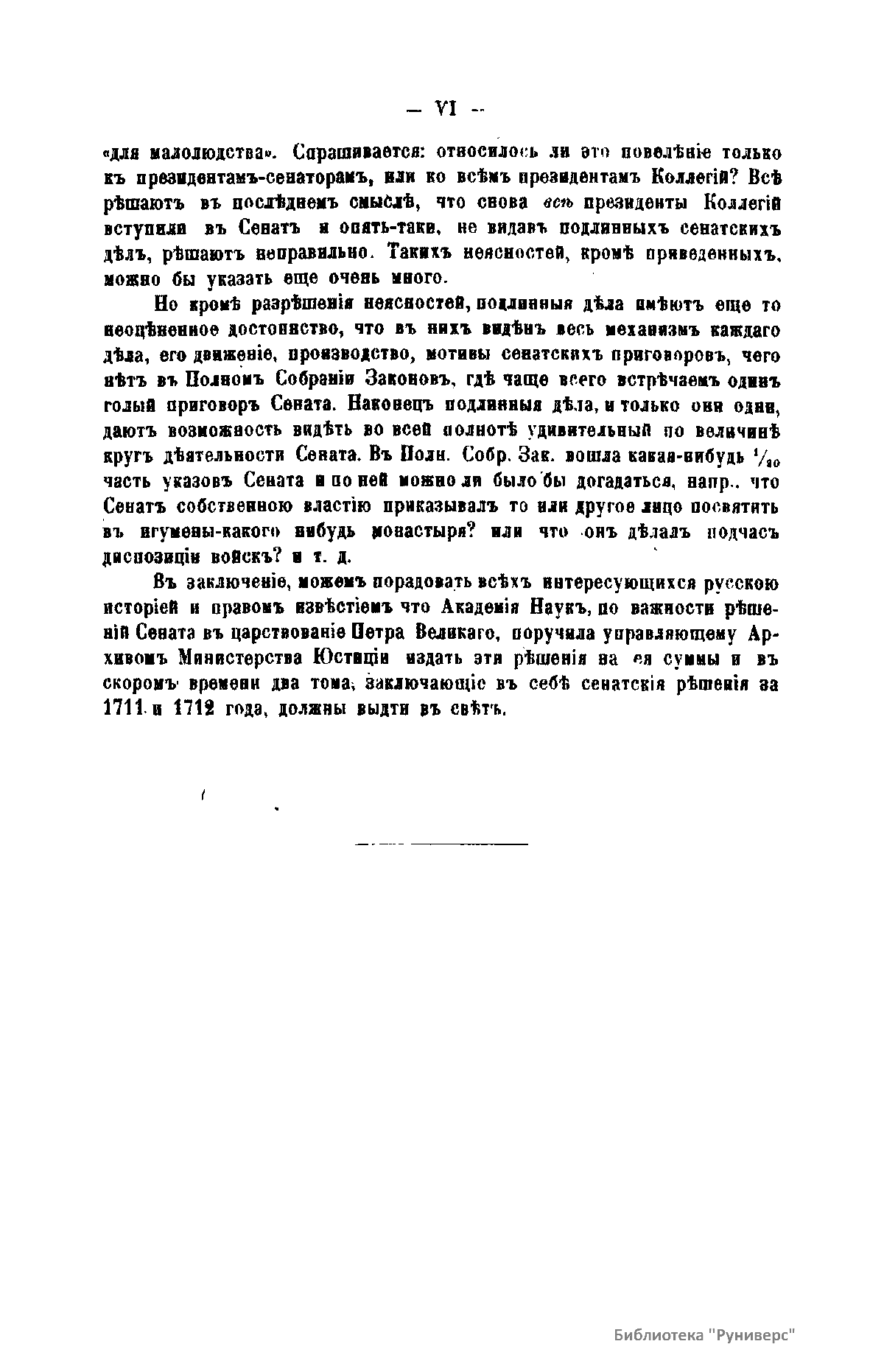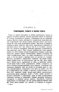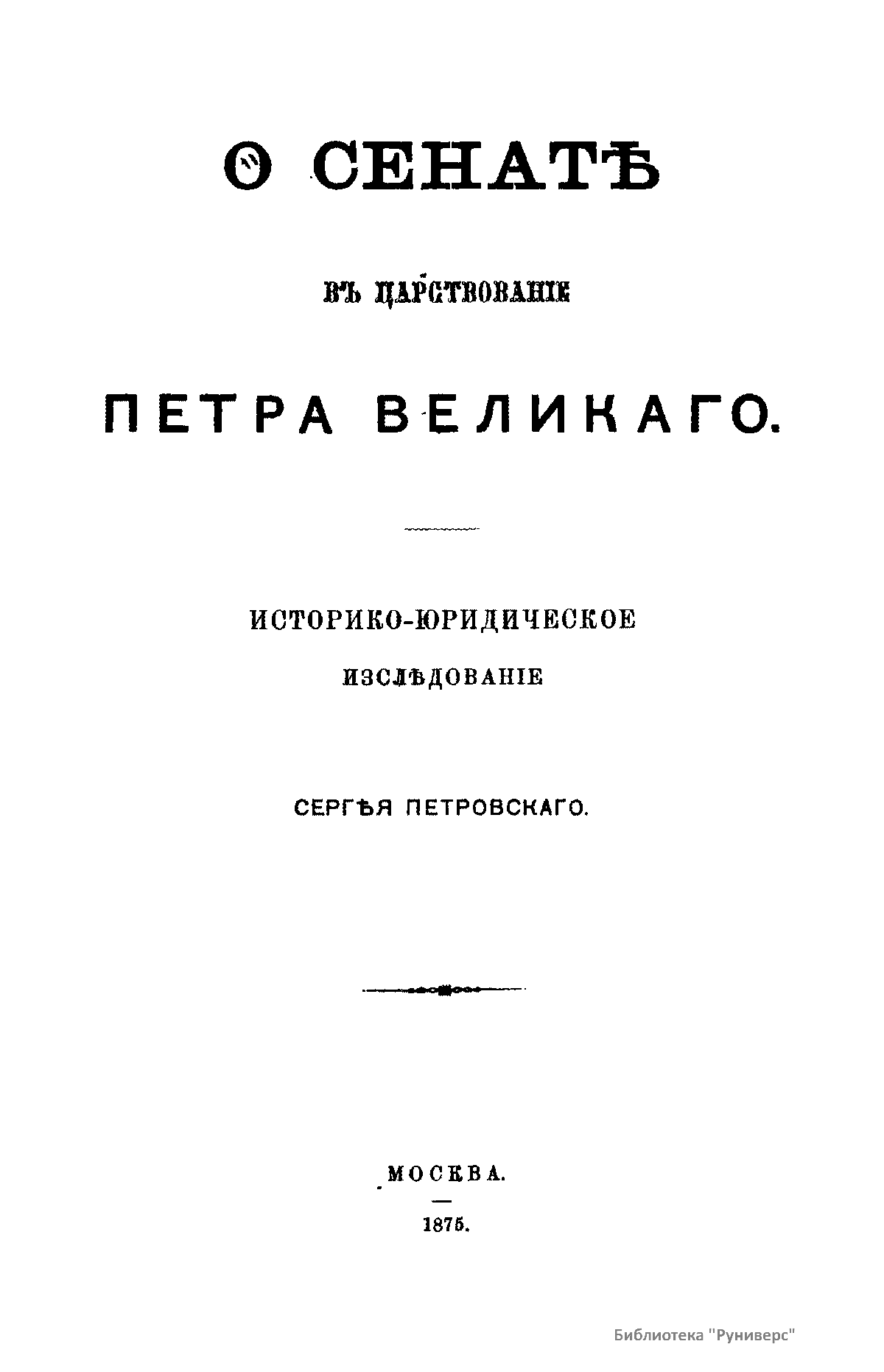 Сенат (1711 – 1917), высший государственный орган, подчиненный императору. Учрежден Петром Великим как высший орган по делам законодательства и государственного управления. С первой половины XIX века высший судебный орган, осуществлял надзор за деятельностью государственных учреждений и чиновников. По Судебным уставам 1864 г. высшая кассационная инстанция. Автор настоящего издания ограничивает свой труд временем Петра. Он считает, что это самая интересная эпоха в истории Сената: в это время он учреждается, растет, развивается и окончательно получает то значение и организацию, с которыми переходит к его преемникам. В книге говорится: о происхождении, развитии и значении Сената; составе Сената; круге ведомства Сената; о делопроизводстве Сената. В своей работе автор пользовался историческими и историко-юридическими сочинениями, а также Полным собранием законов и подлинными делами Сената.