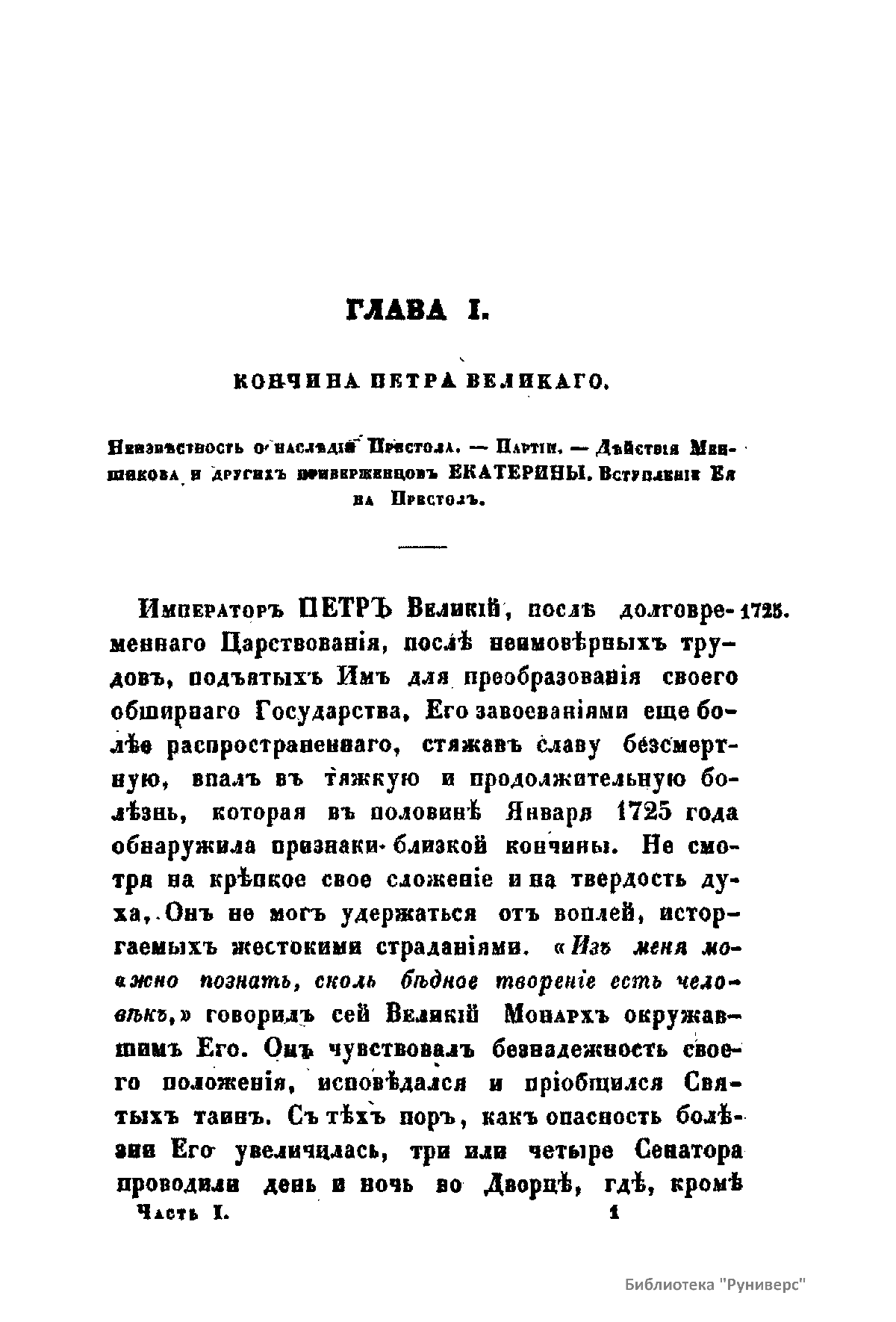 В первой части настоящего издания автор рассказывает о кончине Петра Великого; царствовании Екатерины I Алексеевны; царствовании Петра II Алексеевича; о начале царствования Анны Иоанновны. Вторая часть посвящена царствованию Анны Иоанновны. В третьей части говорится о правлении Бирона и о правлении великой княгини Анны Леопольдовны.