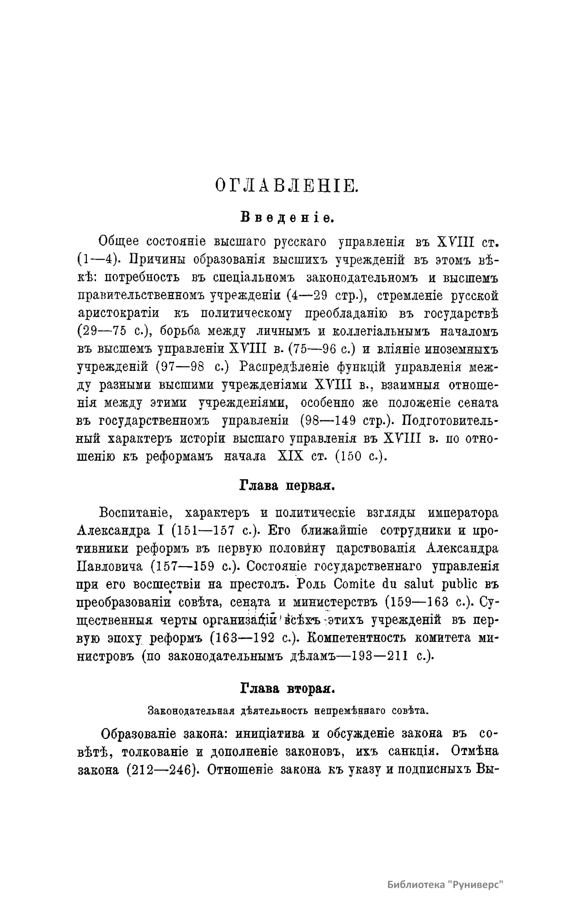 Главная цель первого тома настоящего труда – изучить процесс образования совещательных учреждений в России, важнейшим и заключительным моментом которого является организация Государственного Совета при Александре I. В своем исследовании автор пользуется сравнительно-историческим методом. После введения, в котором рассматривается история иноземных совещательных учреждений, в первой главе сочинения исследуются возникновение и взаимные отношения монархической власти и высшего сословия в Московской Руси: от характера этих отношений зависит политическая роль совещательных учреждений в удельно-вечевую эпоху, московском и императорском периоде русской истории. Вместе с тем автор пытается указать здесь и в последующих главах на отделение высшего управления от местного, образование первого, разделение главных функций власти и взаимные отношения между учреждениями различных названий московского (боярской думой и приказами) и императорского периода (советами, кабинетами, сенатом и др.). При изучении образования Совета при Александре I автор останавливается на характеристике общественного состояния этой эпохи, личности государя и его ближайших сотрудников по преобразованию всего русского управления, учреждении Непременного Совета и его отношении к вновь возникшим в то же время министерствам, комитету министров и к сенату. Еще подробнее исследуется образование Государственного Совета в 1810-1825 годах. Здесь предварительно приводятся главные основания «Государственного Уложения» графа Сперанского. Затем идет изложение самого учреждения Совета и рассмотрение отношения последнего к комитету министров, сенату и министерствам. Первый том заканчивается главой, где русский Государственный совет сравнивается с аналогичными западноевропейскими учреждениями древнего и особенно нового времени.