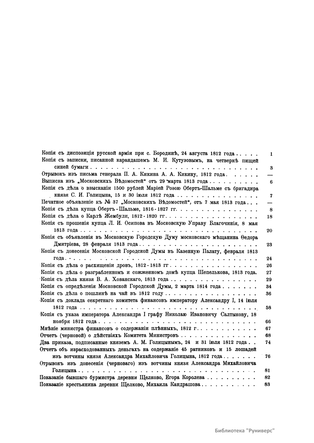 Многочисленные документы, собранные и изданные П.И. Щукиным, относятся к Отечественной войне 1812 года. В издании опубликованы донесения, отчеты, указы, описи, письма разных лиц, протоколы, постановления, предписания, прошения и т.д. В этих бумагах содержатся подробности, которые невозможно встретить ни в одном учебнике истории и которые, будучи собранными вместе, и составляют подлинную картину российской истории начала XIX века.