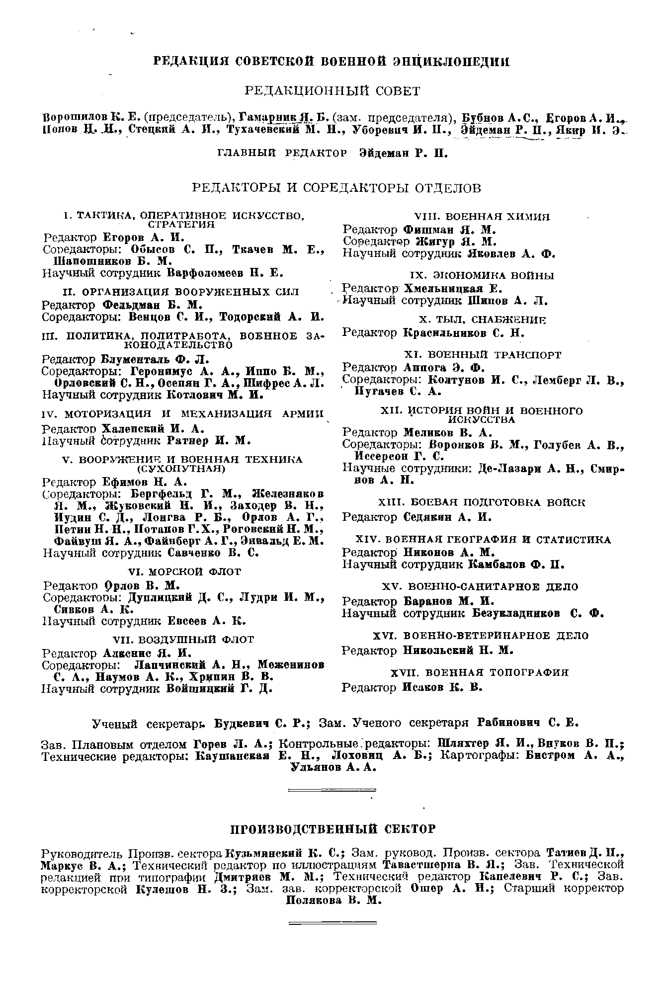 В начале 1930-х гг. в Наркомате обороны СССР была развернута подготовка к изданию многотомной «Советской военной энциклопедии» под редакцией председателя Центрального совета Осоавиахима комкора Р. П. Эйдемана. Однако, в 1932-1933 гг. вышли в свет только 2 тома (до статьи «Варта» включительно). Работа по подготовке следующих томов была остановлена в связи с развернутыми в РККА репрессиями командных кадров (разоблачение «заговора в Красной Армии»). Советская военная энциклопедия представляла собой систематизированный свод военных знаний и справочное издание, дающее научное толкование военных понятий и терминов. Статьи, помещенные в Энциклопедии, по своему характеру делились на военно-теоретические, военно-исторические, военно- технические, военно-географические и биографические. В Энциклопедии были помещены иллюстрации, дополняющие содержание статей, военно-исторические, географические и другие карты, схемы, рисунки, фотографии, репродукции.Статьи размещены в алфавитном порядке. Главные темы: - военное строительство (общие вопросы; виды вооруженных сил, рода войск и воинские формирования; организация и персоналии); - военная техника и вооружение (оружие, военное образование и специальности, должности и звания, воинские награды, форма одежды и т. д.); - военное искусство (теория и практика; виды военных (боевых) действий, их обеспечение; управление войсками и боевыми средствами; боевая и оперативная подготовка войск); - военная история (войны, походы, сражения, битвы, операции, вооружённые восстания и революции — от Древнего мира до Новейшего времени); - военная география (географические объекты, государства и территории, общенаучные понятия).