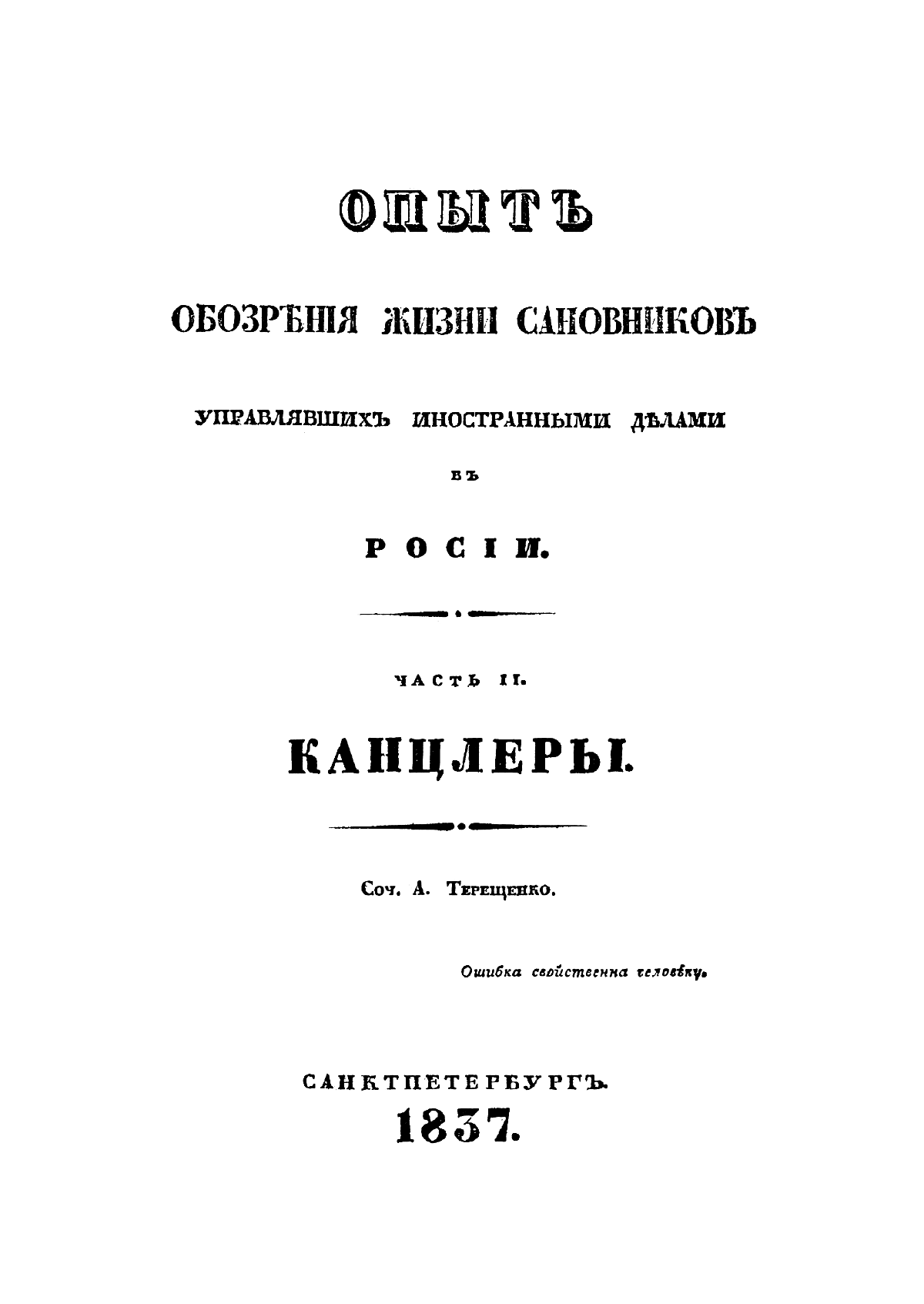 Терещенко Александр Власьевич (1806–1865) — этнограф и археолог, был сотрудником Археографической комиссии. Главные его труды: «Опыт обозрения жизни сановников, управлявших иностранными делами в России», «Быт русского народа», «Очерки Новороссийского края». «Опыт обозрения жизни сановников» состоит из трех частей. Первая часть посвящена сановникам, управлявшим иностранными делами до учреждения звания канцлеров, вторая — канцлерам, третья — вице-канцлерам. В издании полно представлены жизнеописания виднейших русских дипломатов — А. Л. Ордын-Нащокина, А. С. Матвеева, В. В. Голицына, А. П. Бестужева-Рюмина, Н. П. Румянцева, В. П. Кочубея, А. Б. Куракина и многих других. Автор уделяет внимание не только успехам именитых сановников на внешнеполитическом поприще, но и рассказывает об их происхождении, семье, характере, привычках.