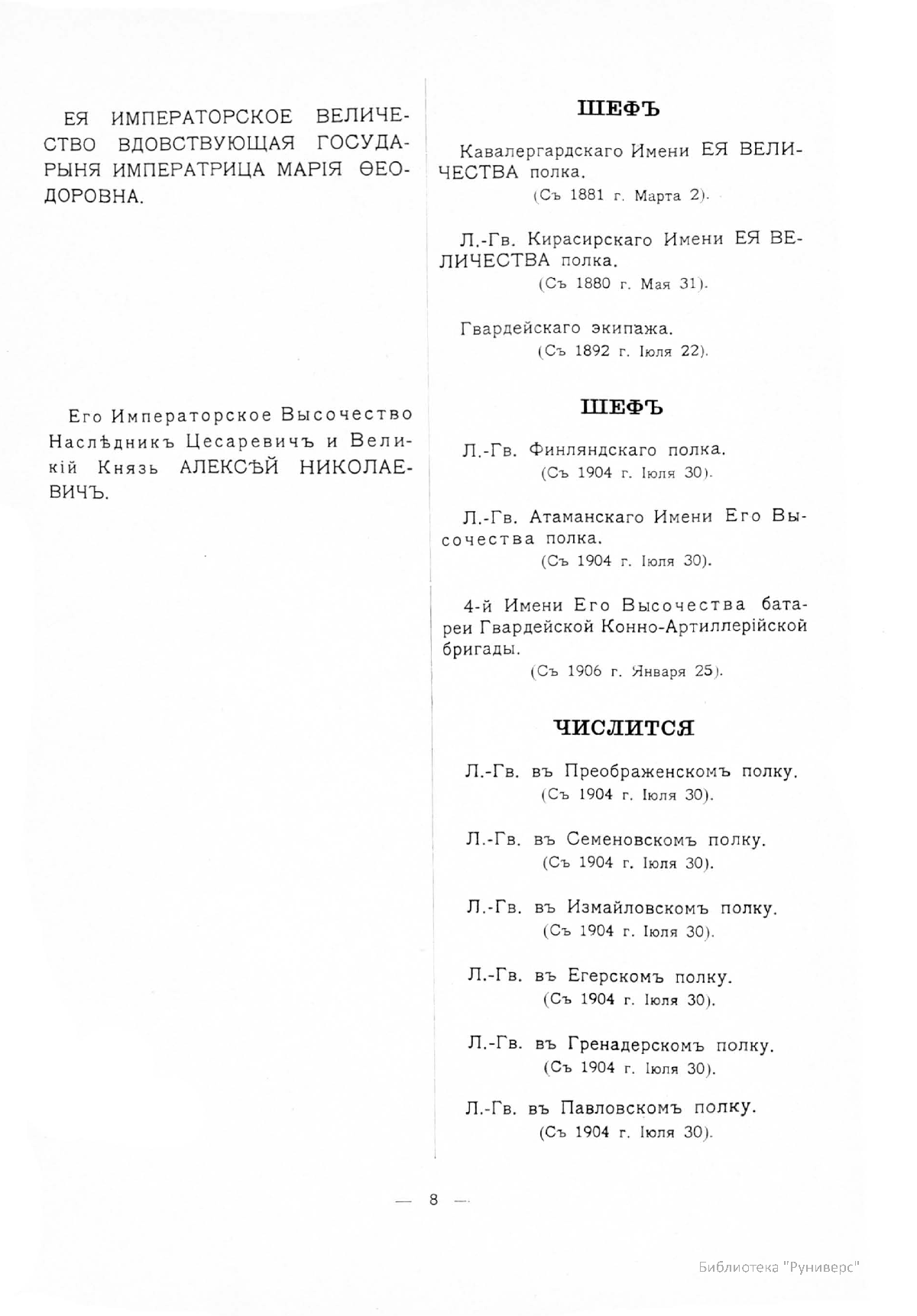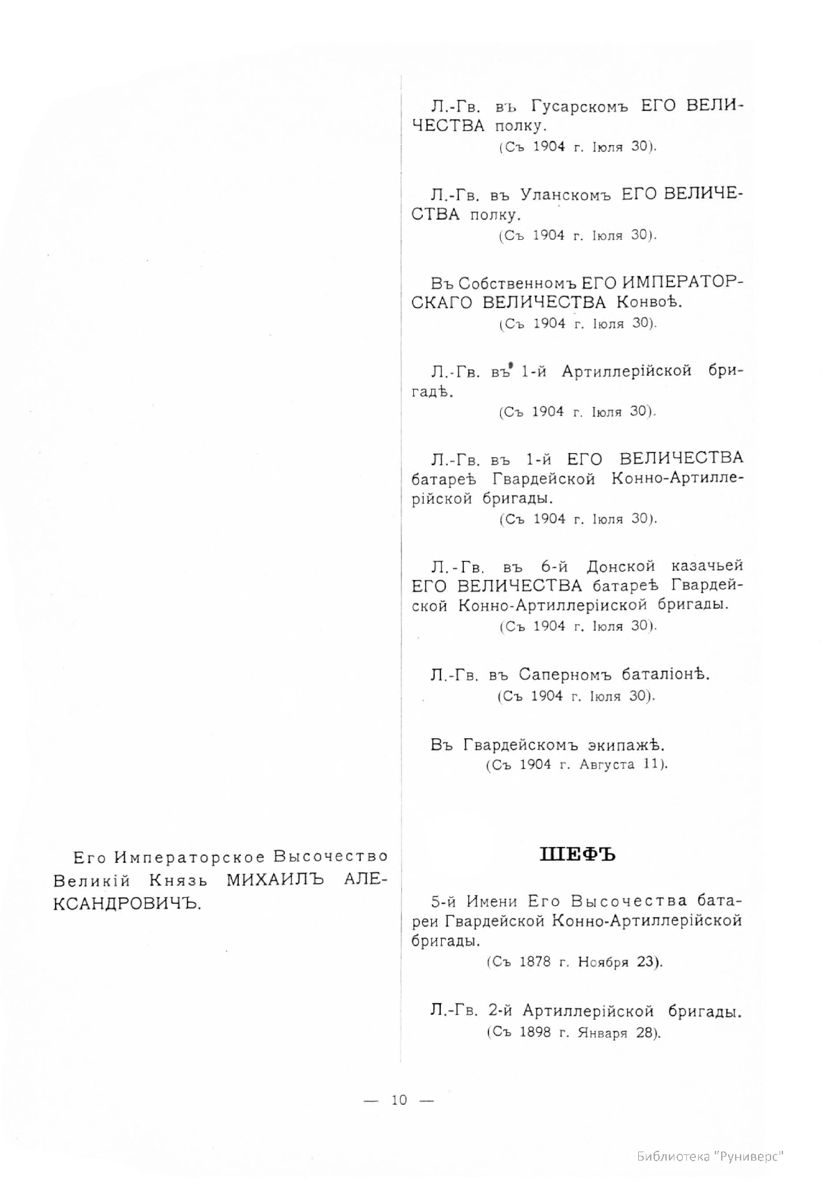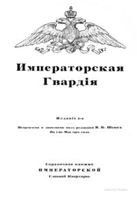 Краткие истории частей Императорской гвардии, наименования и переименования, командиры, шефы, боевой путь, награды гвардейских частей. Широко известные цветные таблицы униформы, составленные В. К. Шенком.