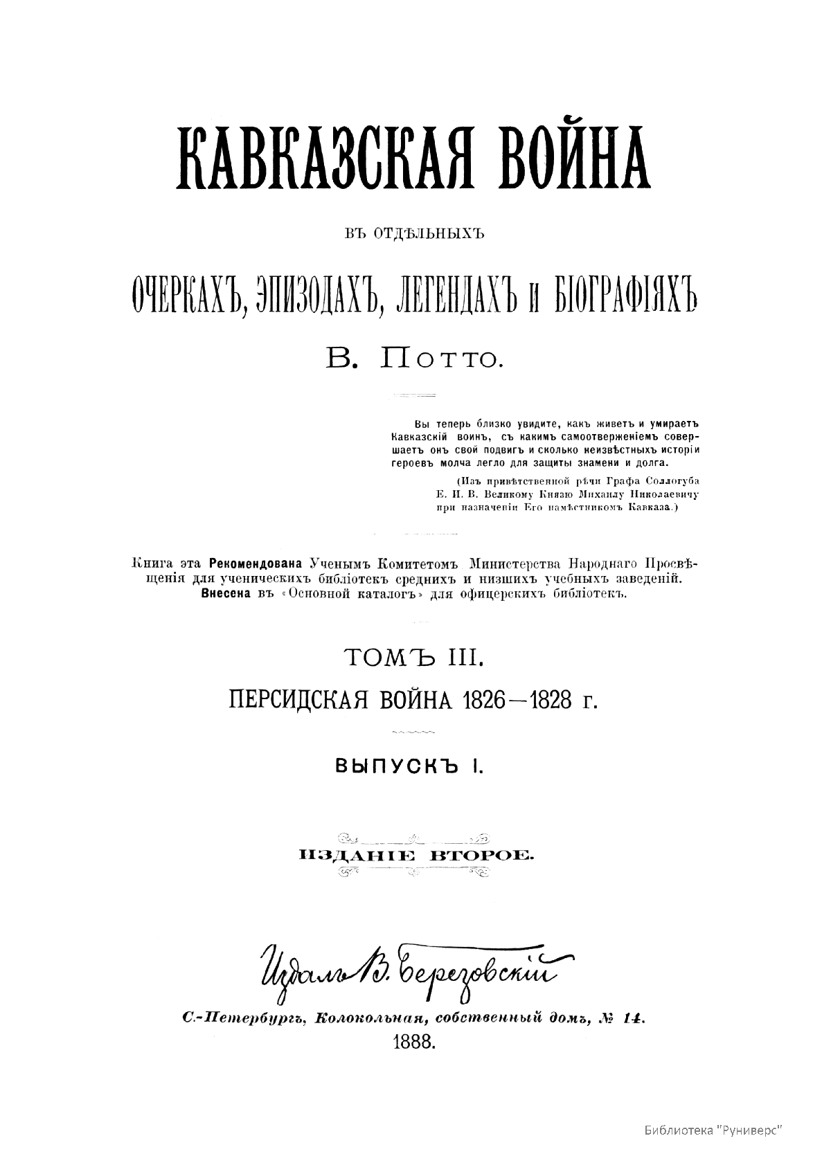 Кавказская война въ отдѣльныхъ очеркахъ, эпизодахъ, легендахъ и бiографияхъ. Томъ 3-й. Персидская война 1826-1828 г.
