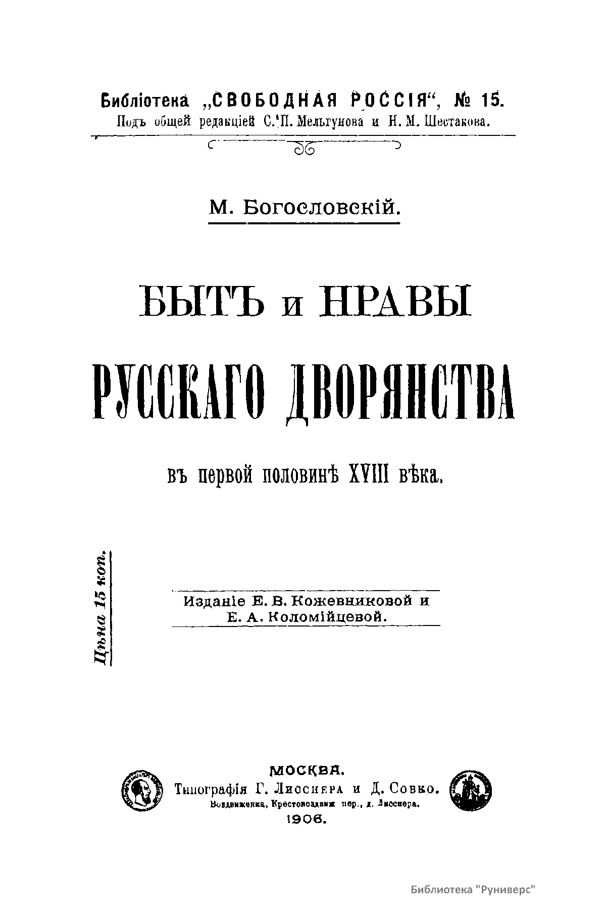 Бытъ и нравы русскаго дворянства въ первой половинѣ XVIII вѣка