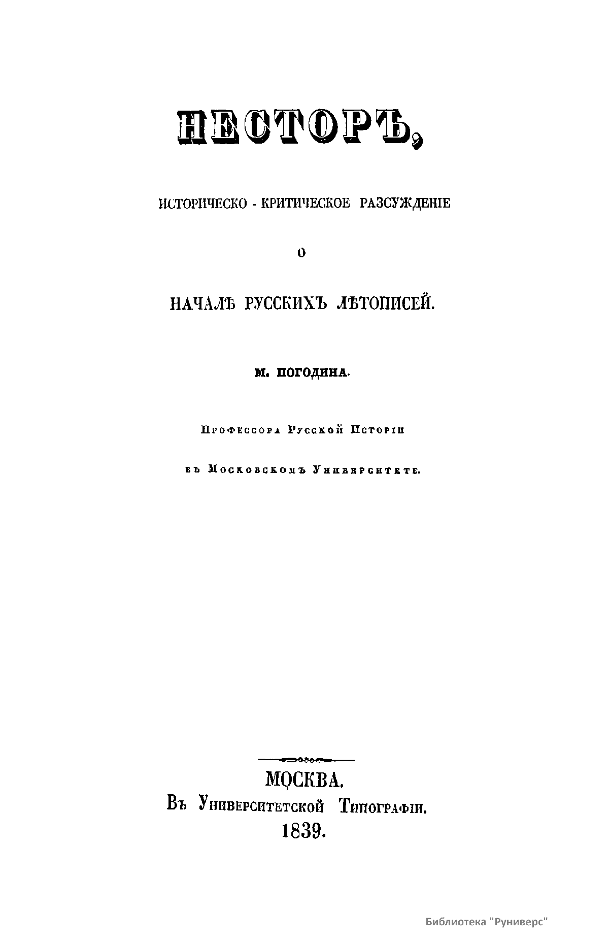 Несторъ, историческо-критическое разсужденiе о началѣ русскихъ лѣтописей