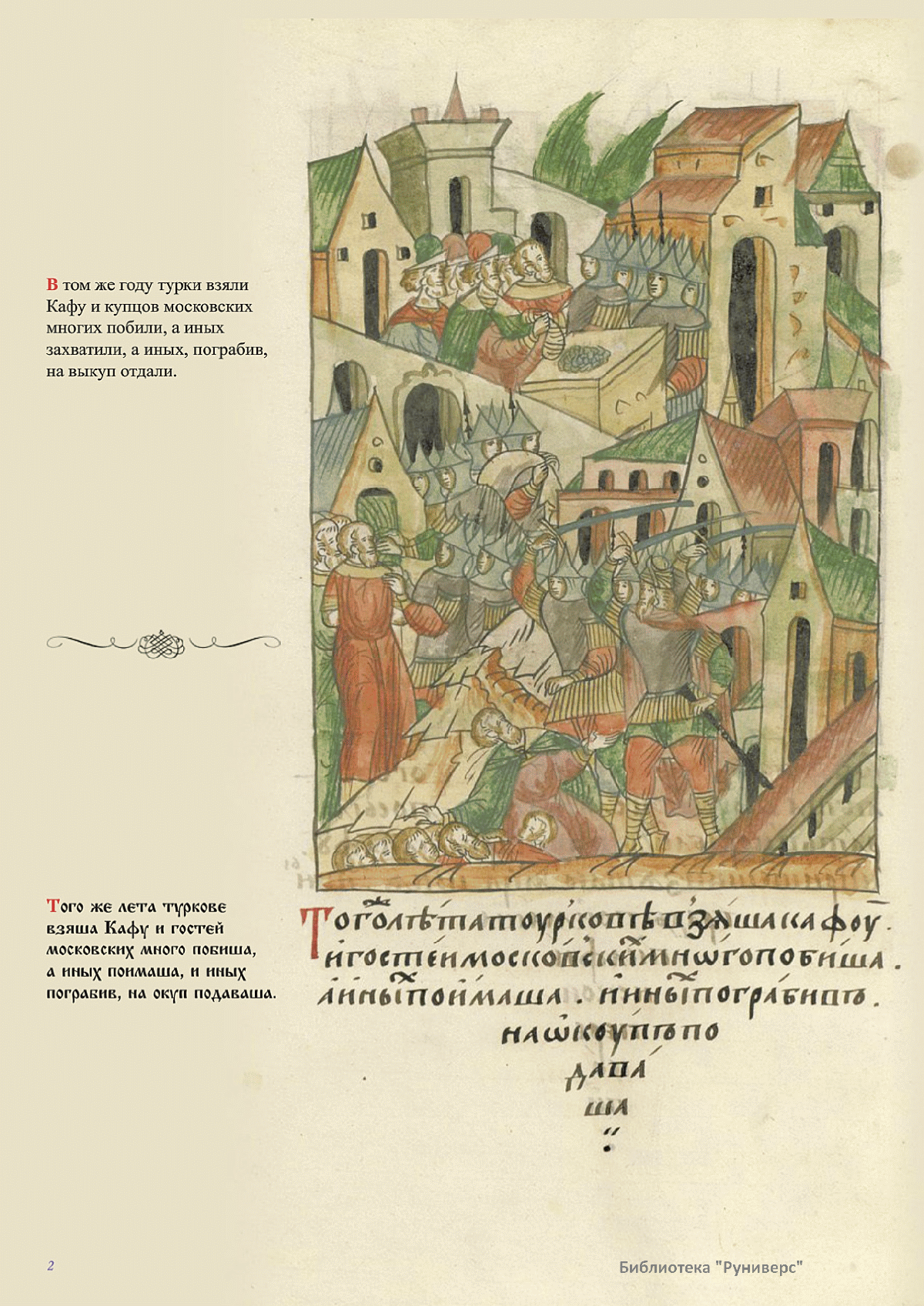 Лицевой летописный свод. XVI века — монументальный памятник древнерусского книжного искусства. На 10 тысячах листов с более чем 17 тысячами красочных миниатюр — «окон в историю» — представлена самая ранняя историческая и литературная энциклопедия. Лицевой свод дошел до наших дней в 10 томах, находящихся в разных древлехранилищах: БАН к РНБ в Санкт-Петербурге и ГИМ в Москве. Фирма «АКТЕОН» совместно с хранителями впервые осуществила научное факсимильное издание «Лицевой летописный свод XVI века». Предлагаемое издание с переводом — как дополнение в рамках научного аппарата вышеназванного факсимиле - представлено тремя разделами: библейская история, всемирная история, русская летописная история. В настоящем издании листы расположены в хронологическом порядке повествования На внешнем поле размещены транслитерация и перевод на современный русский язык. Русская летописная история 1114—1567 гг. — отражена на 6010 Лицевого летописного свода XVI века в следующих его томах: Г — Голицынский том (Отдел рукописей Российский национальной библиотеки, F.IV.225), Л — Лаптевский TOM (Отдел рукописей Российской национальной библиотеки, F.IV.233), O-I — Остермановский первый том (Отдел рукописей Библиотеки Академии наук, 31. 7. 30-1), O-II — Остермановский второй той (Отдел рукописей Библиотеки Академии наук, 31, 7. 30-2), Ш — Шумиловский том (Отдел рукописей Российской национальной библиотеки, F, IY. 232), С — Синодальный том (Отдел рукописей Государственного Исторического музея. Син. № 962), Ц— Царственная книга (Отдел рукописей Государственного Историческою музея. Син. № 149). В сносках отряжены разночтения с перепей ПСРЛ — Полным собранием русских летописей - фундаментальной для изучения истории древней и средневековой Руси книжной серией (её тексты, в основном, издавались наборно, в орфографии XIX века).