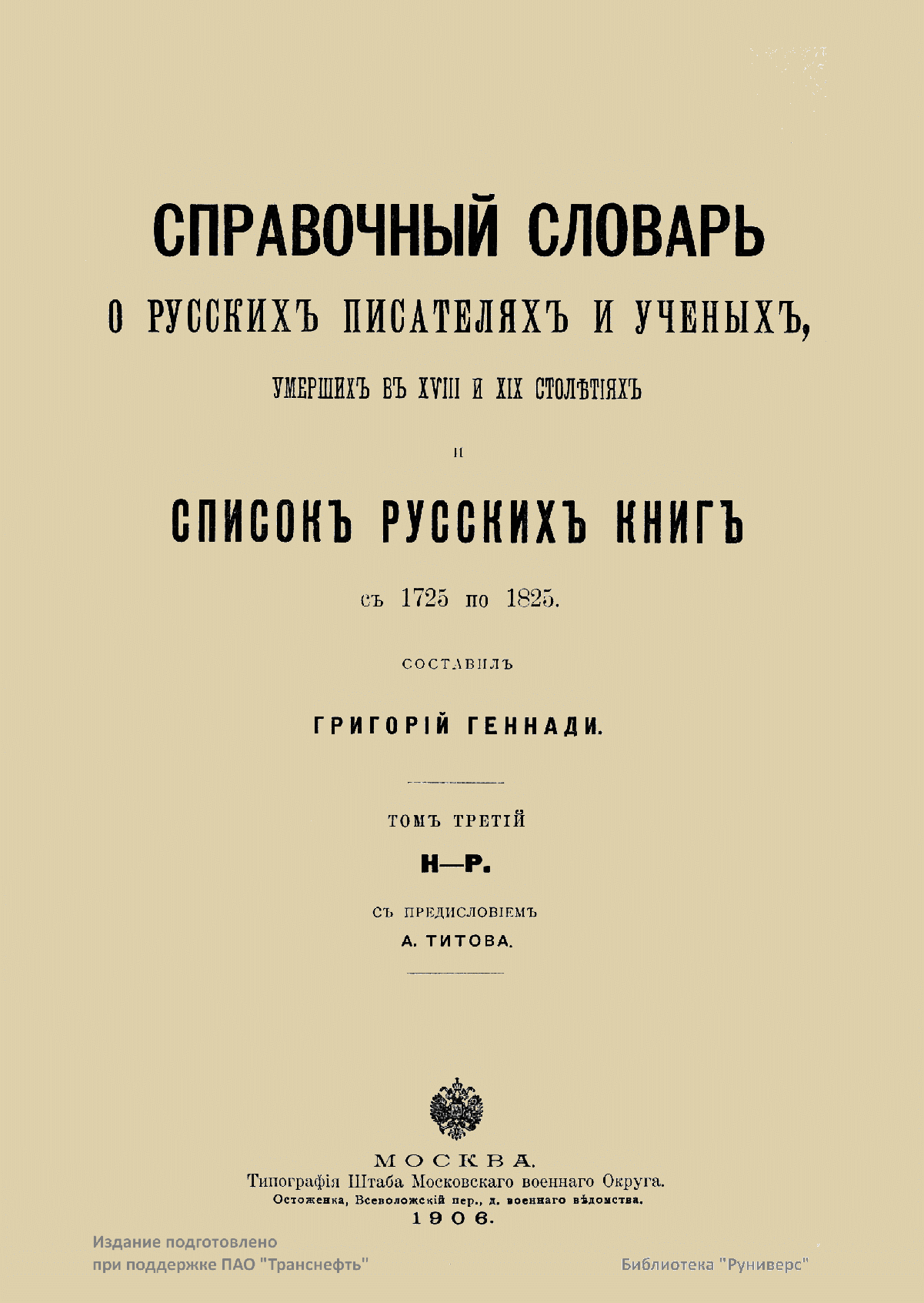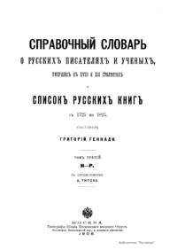 Справочный словарь о русскихъ писателяхъ и ученыхъ, умершихъ въ XVIII и XIX столѣтiяхъ, и списокъ русскихъ книгъ съ 1725 по 1825 г. Томъ третiй Н-Р