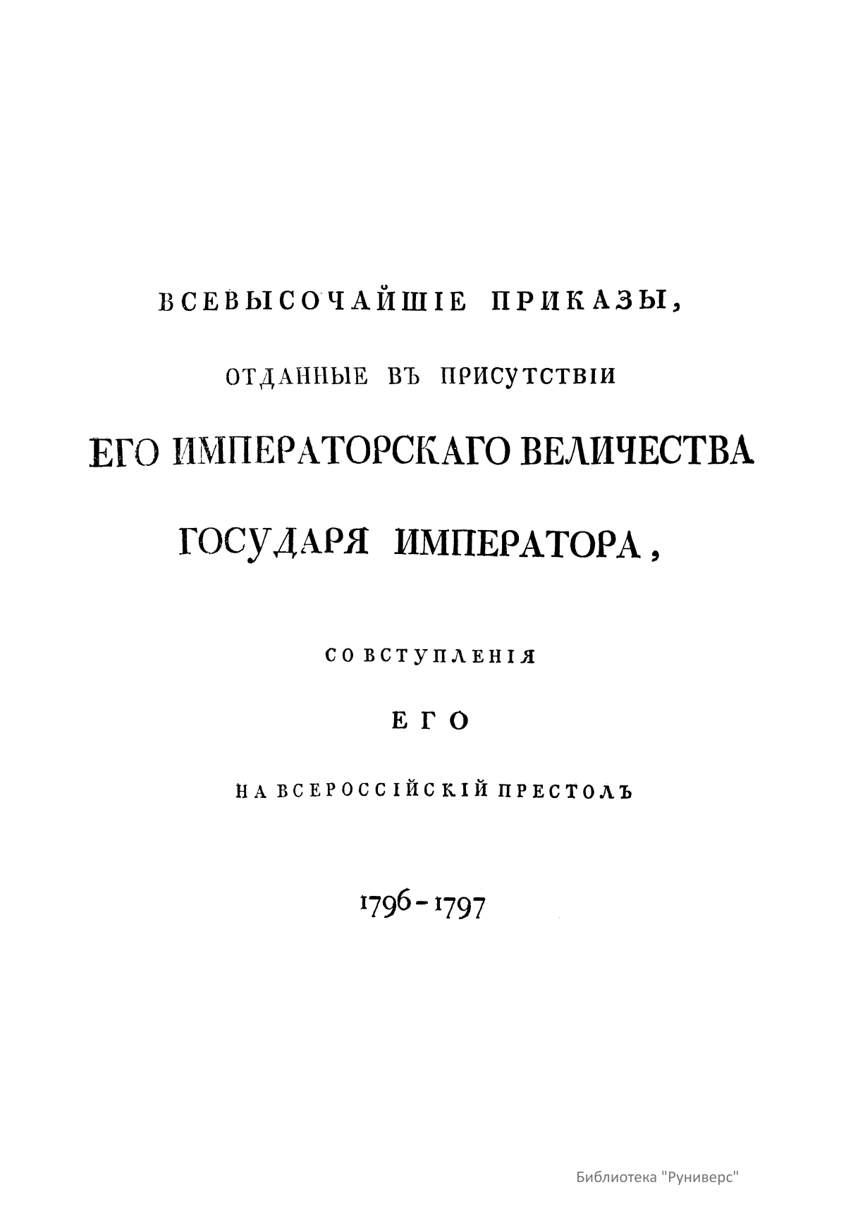 Всевысочайшие приказы, отданные в присутствии Его Императорского Величества Государя Императора, со вступления его на Всероссийкий престол.