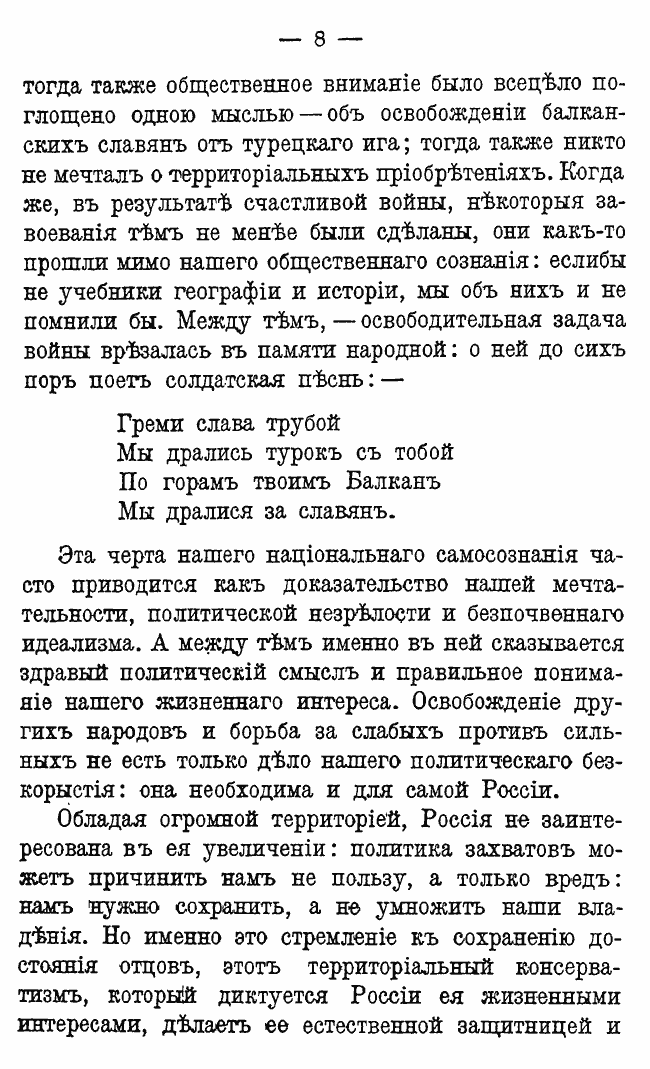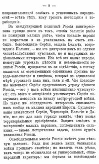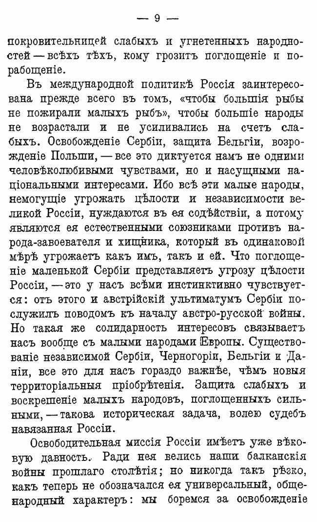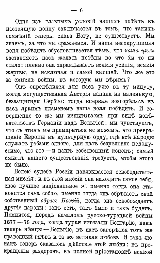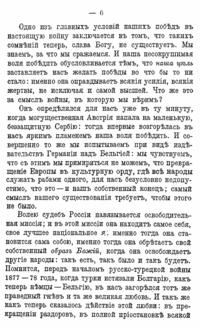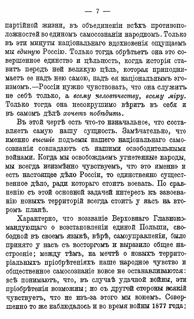 «Волею судеб России навязывается освободительная миссия; и в этой миссии она находит самое себя, свое лучшее национальное я... России нужно чувствовать, что она служит не себе только, а всему человечеству, всему миру».
