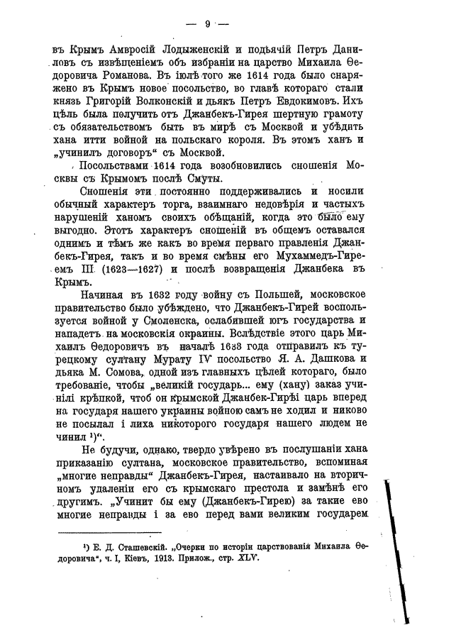 Главным средством к существованию крымских татар всегда являлась разбойничья добыча. Татары постоянно грабили своих соседей – Московское государство и Польшу. «Разбойничье гнездо» крымцев долго сохраняло свою самостоятельность и своё значение, так как при постоянной обостренности польско-московских отношений крымские ханы за деньги охотно служили орудием то Польши, то Москвы. Автор рассматривает историю московско-крымских отношений первой половины XVII века и подробно останавливается на посольстве Тимофея Анисимова и Калистрата Акинфиева во время Русско-польской (Смоленской) войны (1632 – 1634), когда с ханом Джанбек Гиреем был заключен договор, по которому восстанавливался мир с Крымом и была обещана помощь против польского короля Владислава.
