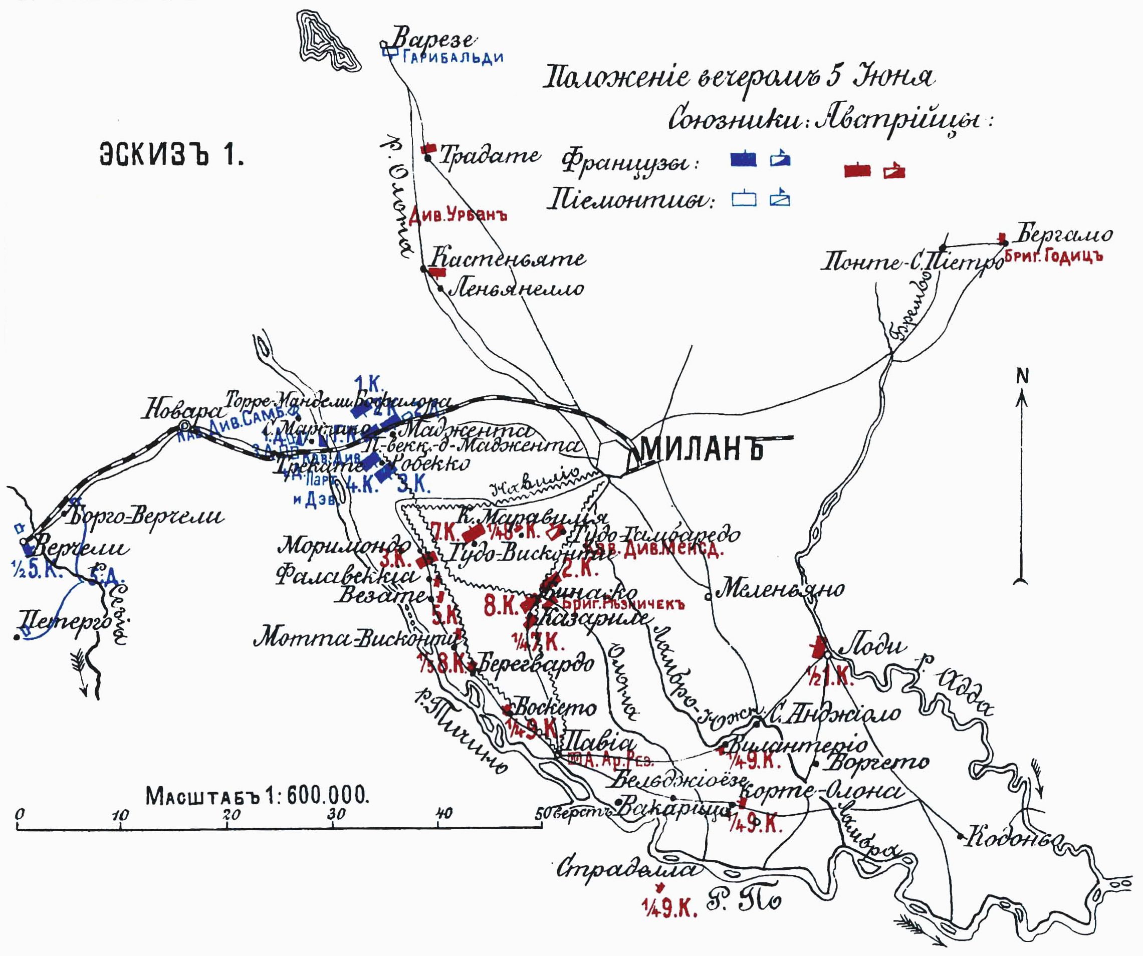 Бой при Меленьяно 8-го июня 1859 года. Эскиз №1. Положение вечером 5 июня
