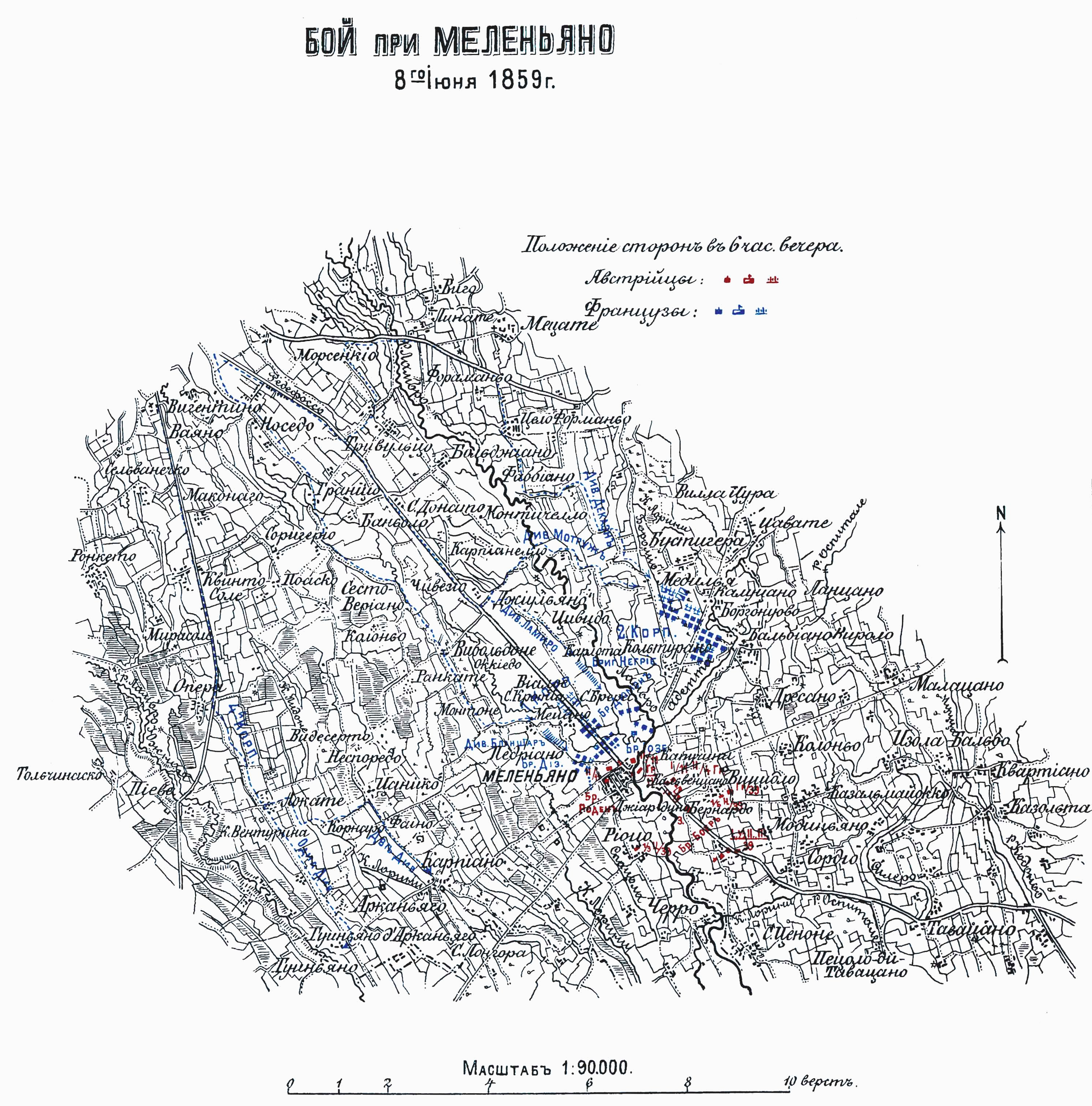 Бой при Меленьяно 8-го июня 1859 года. Положение сторон в 6 часов вечера