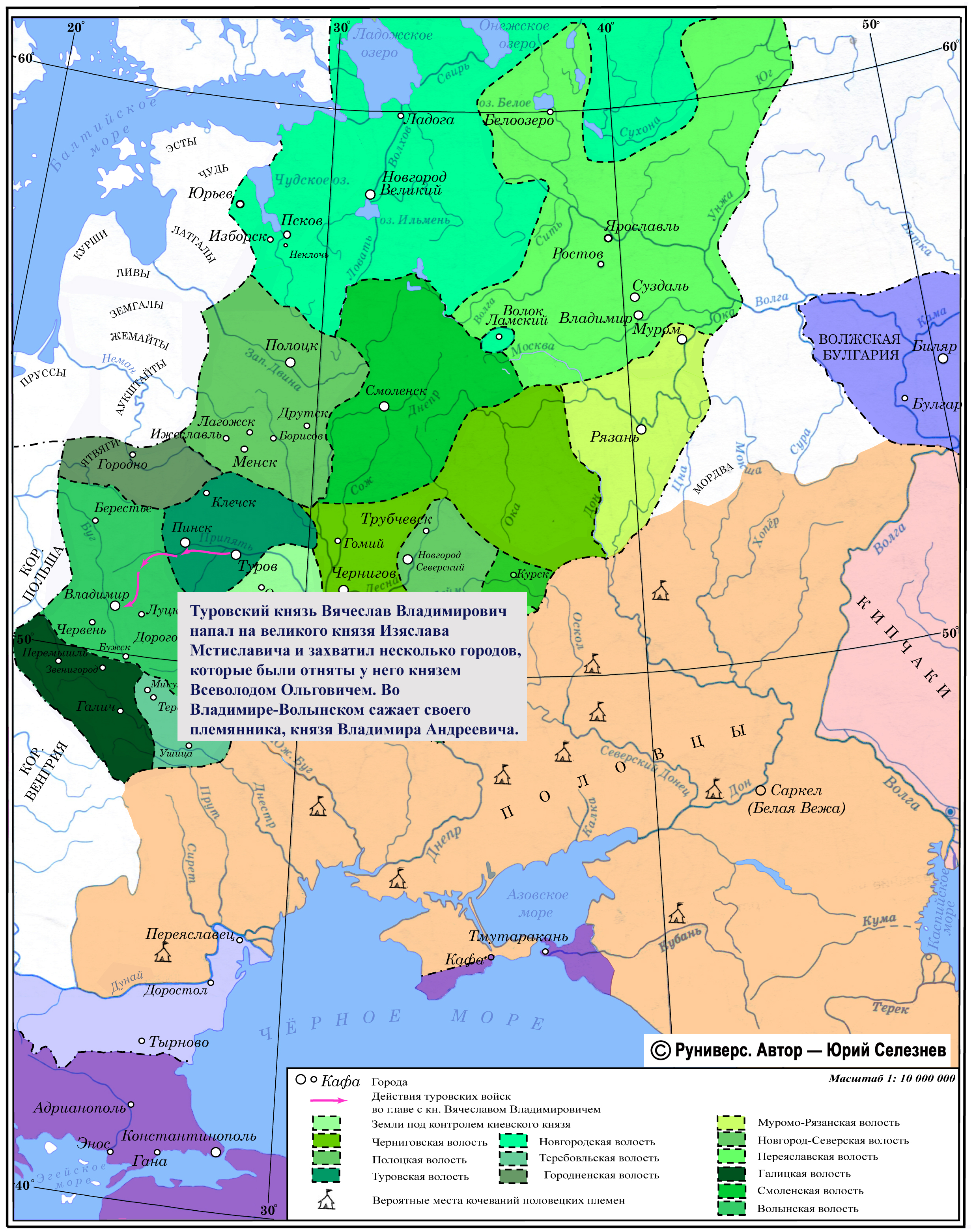 Туровский князь Вячеслав Владимирович напал на великого князя Изяслава Мстиславича и захватил несколько городов, которые были отняты у него князем Всеволодом Ольговичем. Во Владимире-Волынском сажает своего племянника, князя Владимира Андреевича.