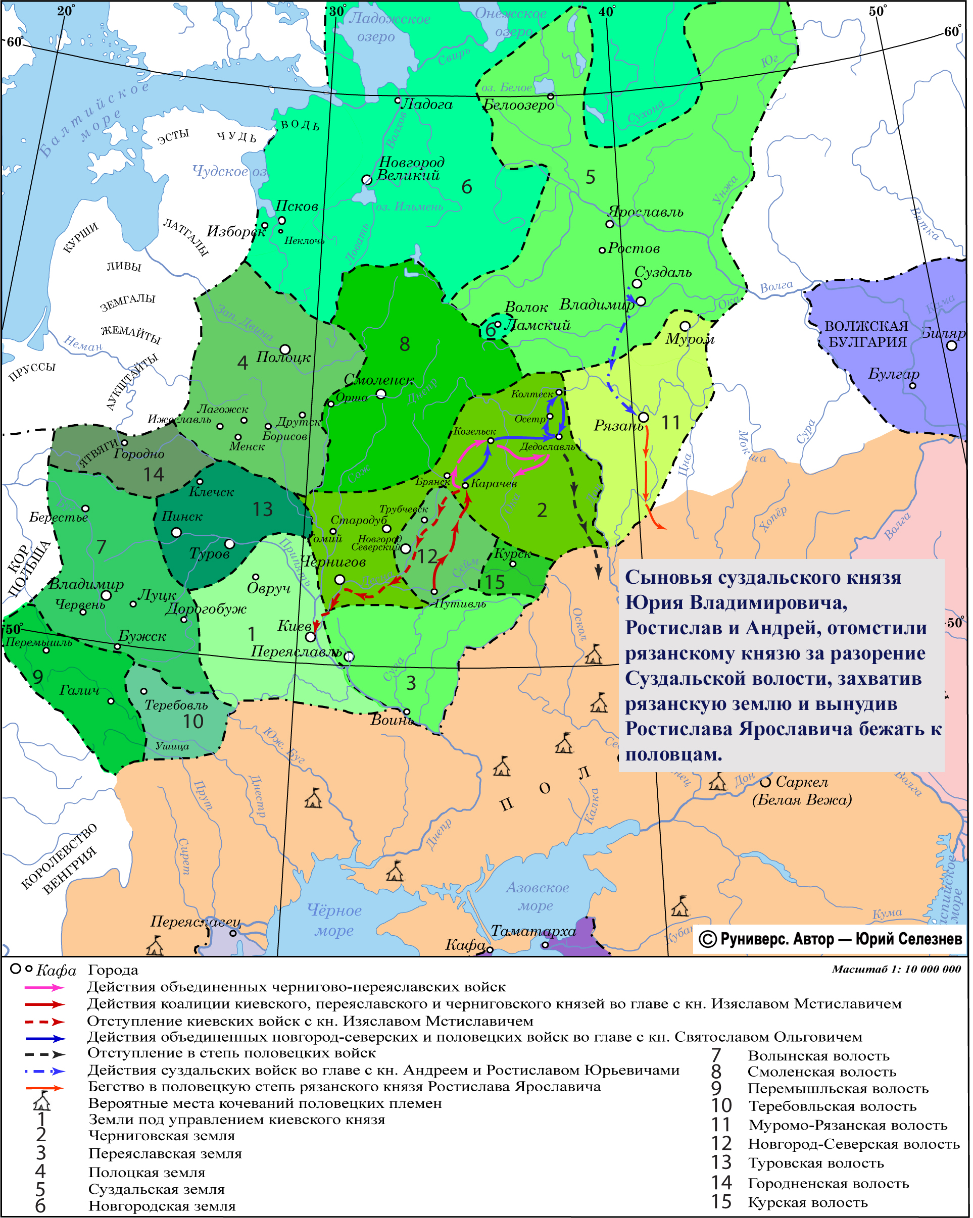 Сыновья суздальского князя Юрия Владимировича, Ростислав и Андрей, отомстили рязанскому князю за разорение Суздальской волости, захватив рязанскую землю и вынудив Ростислава Ярославича бежать к половцам.