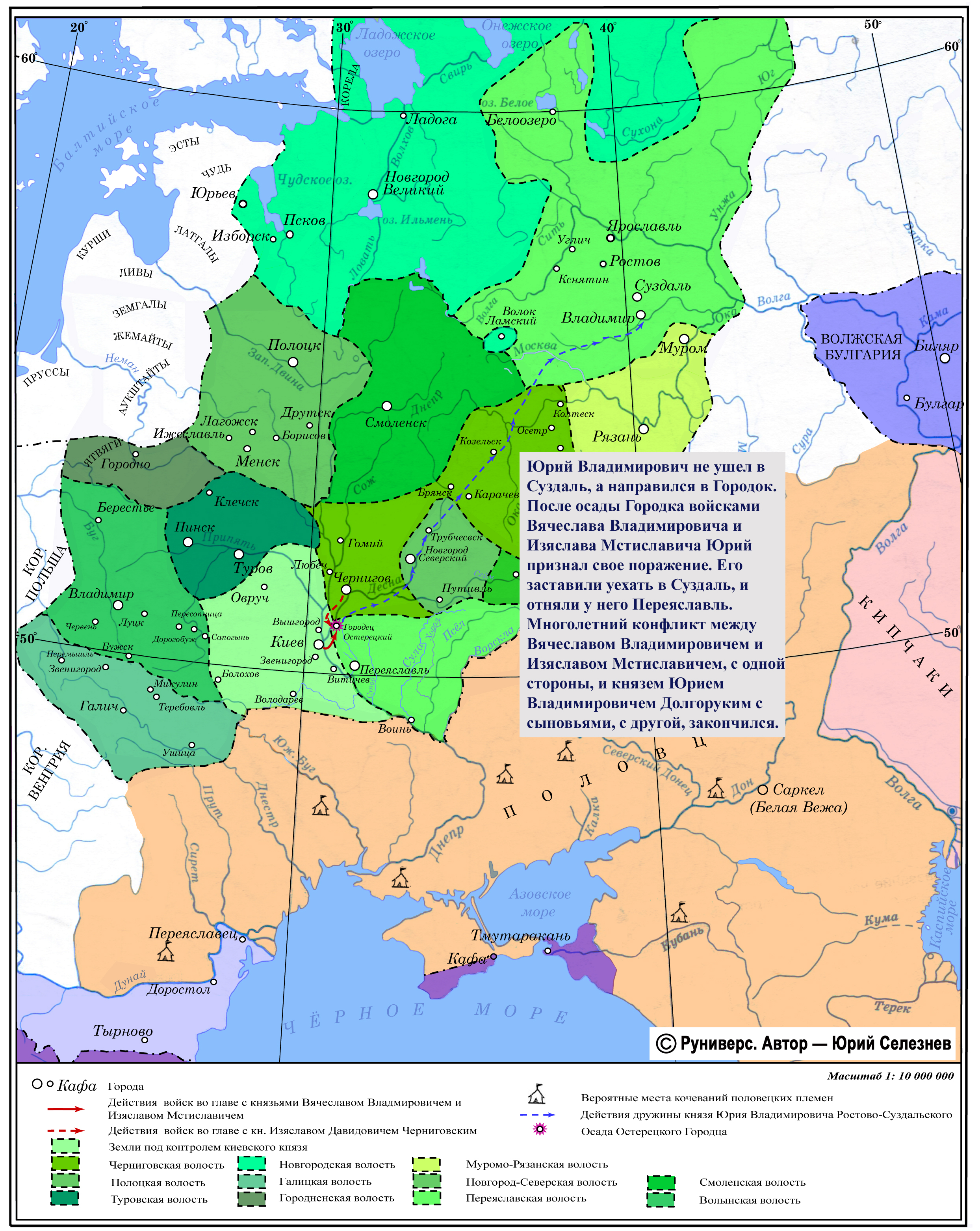 Юрий Владимирович не ушел в Суздаль, а направился в Городок. После осады Городка войсками Вячеслава Владимировича и Изяслава Мстиславича Юрий признал свое поражение. Его заставили уехать в Суздаль, и отняли у него Переяславль. Многолетний конфликт между Вячеславом Владимировичем и Изяславом Мстиславичем, с одной стороны, и князем Юрием Владимировичем Долгоруким с сыновьями, с другой, закончился.