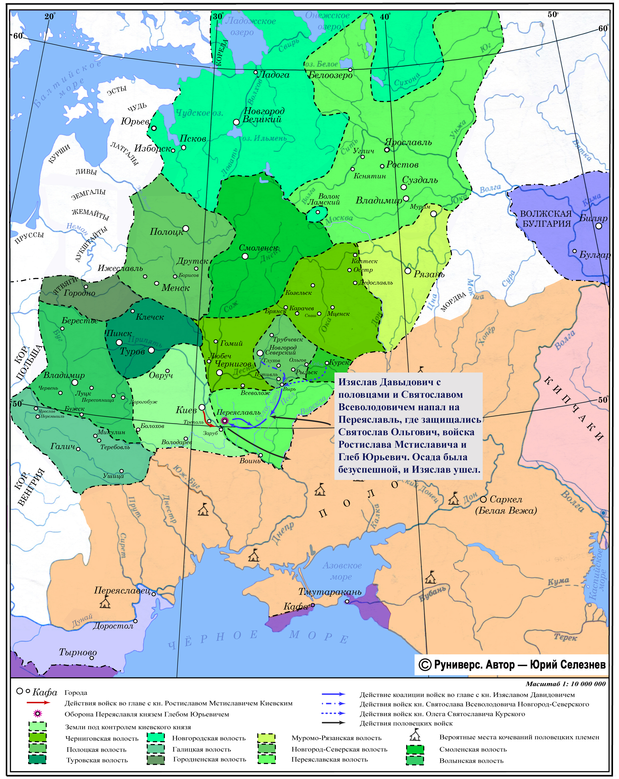 Изяслав Давыдович с половцами и Святославом Всеволодовичем напал на Переяславль, где защищались Святослав Ольгович, войска Ростислава Мстиславича и Глеб Юрьевич. Осада была безуспешной, и Изяслав ушел.