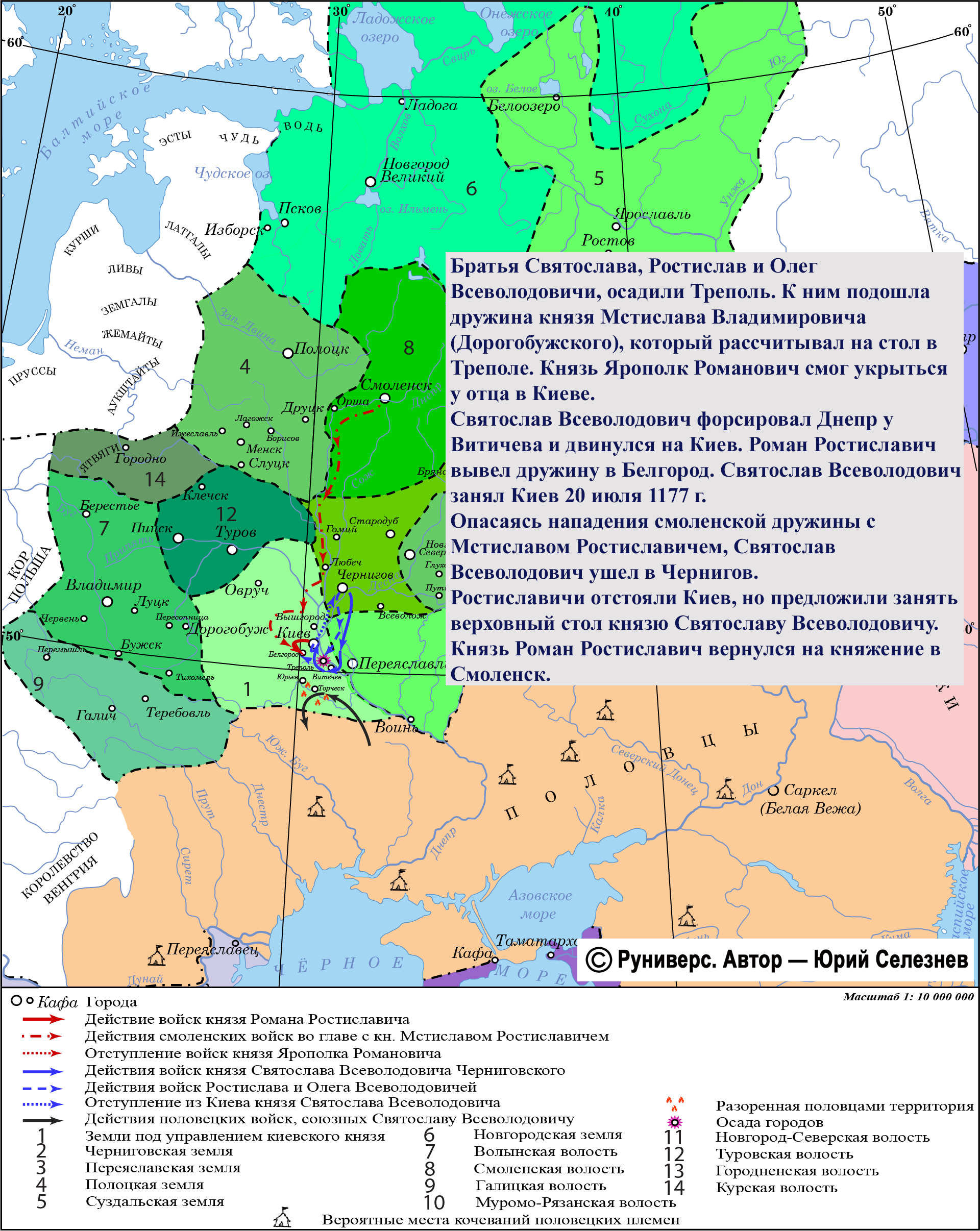 Военные действия против киевского князя Романа Ростиславича начал черниговский князь Святослав Всеволодович из-за отказа князя Романа лишить владений Давида Ростиславича, на которого князь Святослав возложил вину за поражение от половцев во время их набега в июне 1177 г.