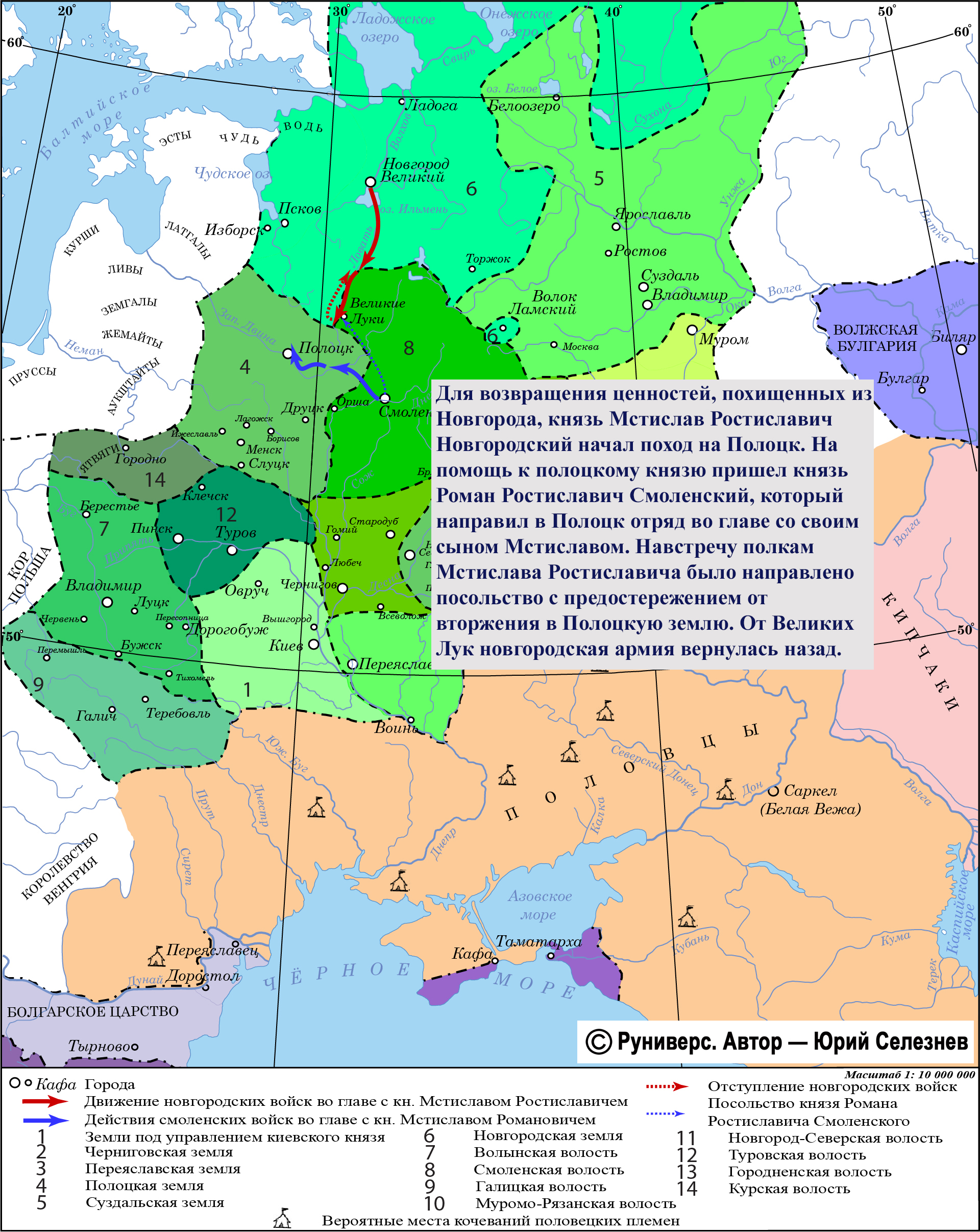 Князь Мстислав Ростиславич Новгородский начал поход на Полоцк, обвиняя князя Всеслава Васильковича в разграблении Новгорода его предком: было решено возвратить похищенные тогда из новгородских церквей ценности. Однако на помощь к полоцкому князю пришел старший брат Мстислава Ростиславича князь Роман Ростиславич Смоленский. Он направил в Полоцк отряд во главе со своим сыном Мстиславом. Навстречу полкам Мстислава Ростиславича было направлено посольство с предостережением от вторжения в Полоцкую землю. От Великих Лук новгородская армия вернулась назад. 13 июня 1180 г. князь Мстислав Ростиславич скоропостижно скончался.