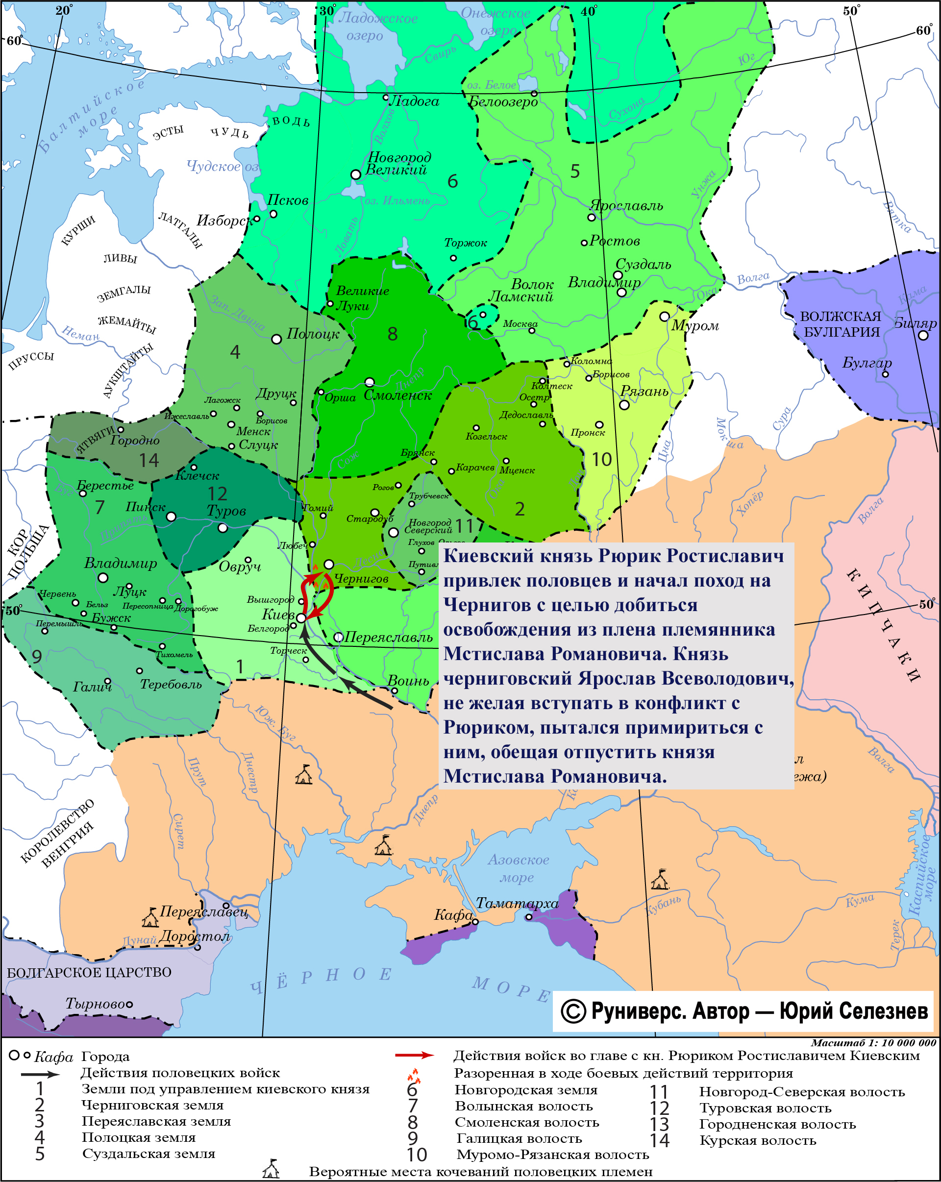 Продолжение усобицы Ольговичей и Ростиславичей. Киевский князь Рюрик Ростиславич привлек половцев и начал поход на Чернигов с целью добиться освобождения из плена племянника Мстислава Романовича. Князь черниговский Ярослав Всеволодович, не желая вступать в конфликт с Рюриком, пытался примириться с ним, обещая отпустить князя Мстислава Романовича.
