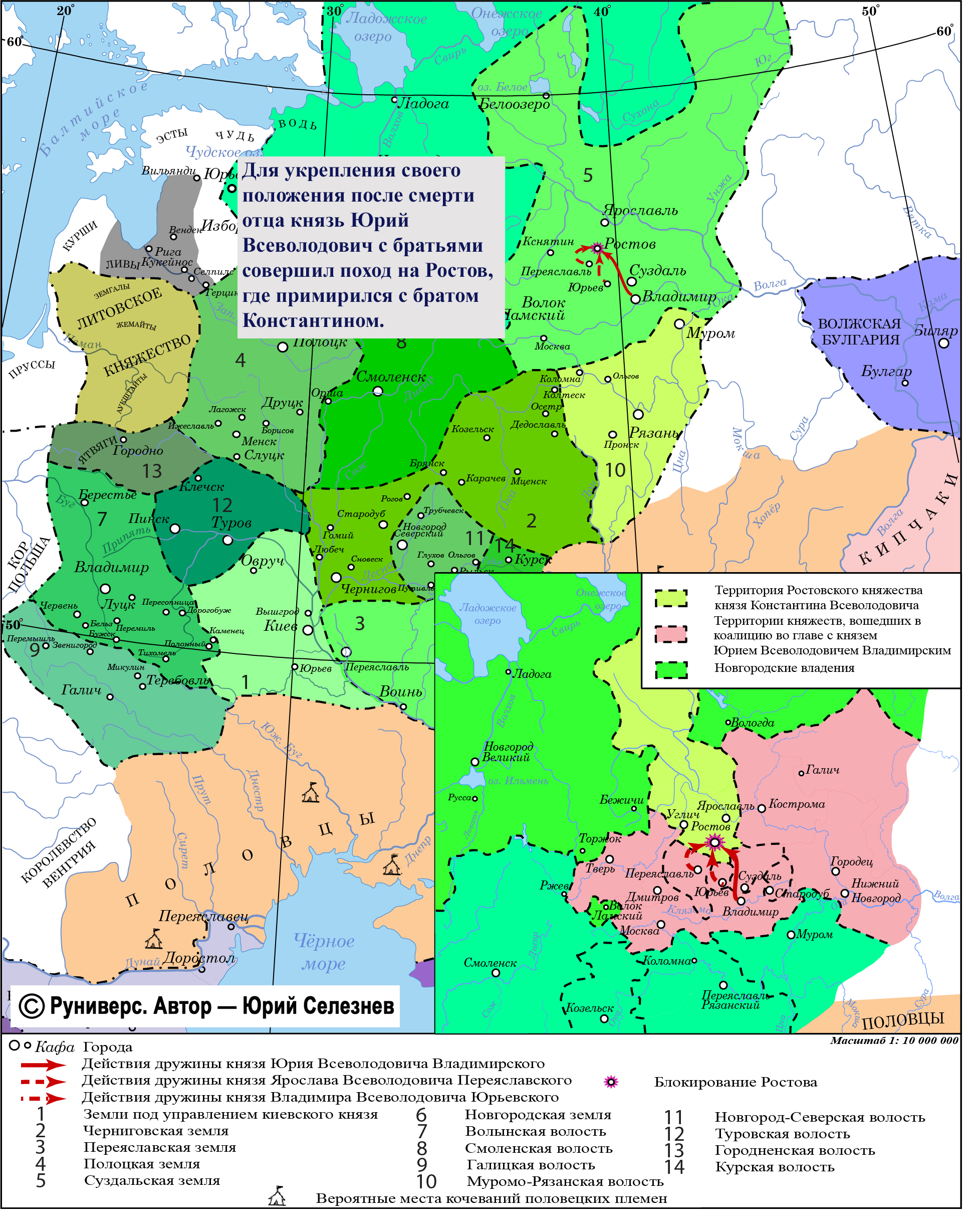 После смерти князя Всеволода Юрьевича Суздальского по его завещанию владимирский стол был оставлен его второму сыну, Юрию (Георгию), поскольку старший Константин заявил о намерении оставить за собой Ростов. Для укрепления своего положения князь Юрий Всеволодович с братьями совершил поход на Ростов, где примирился с братом.
