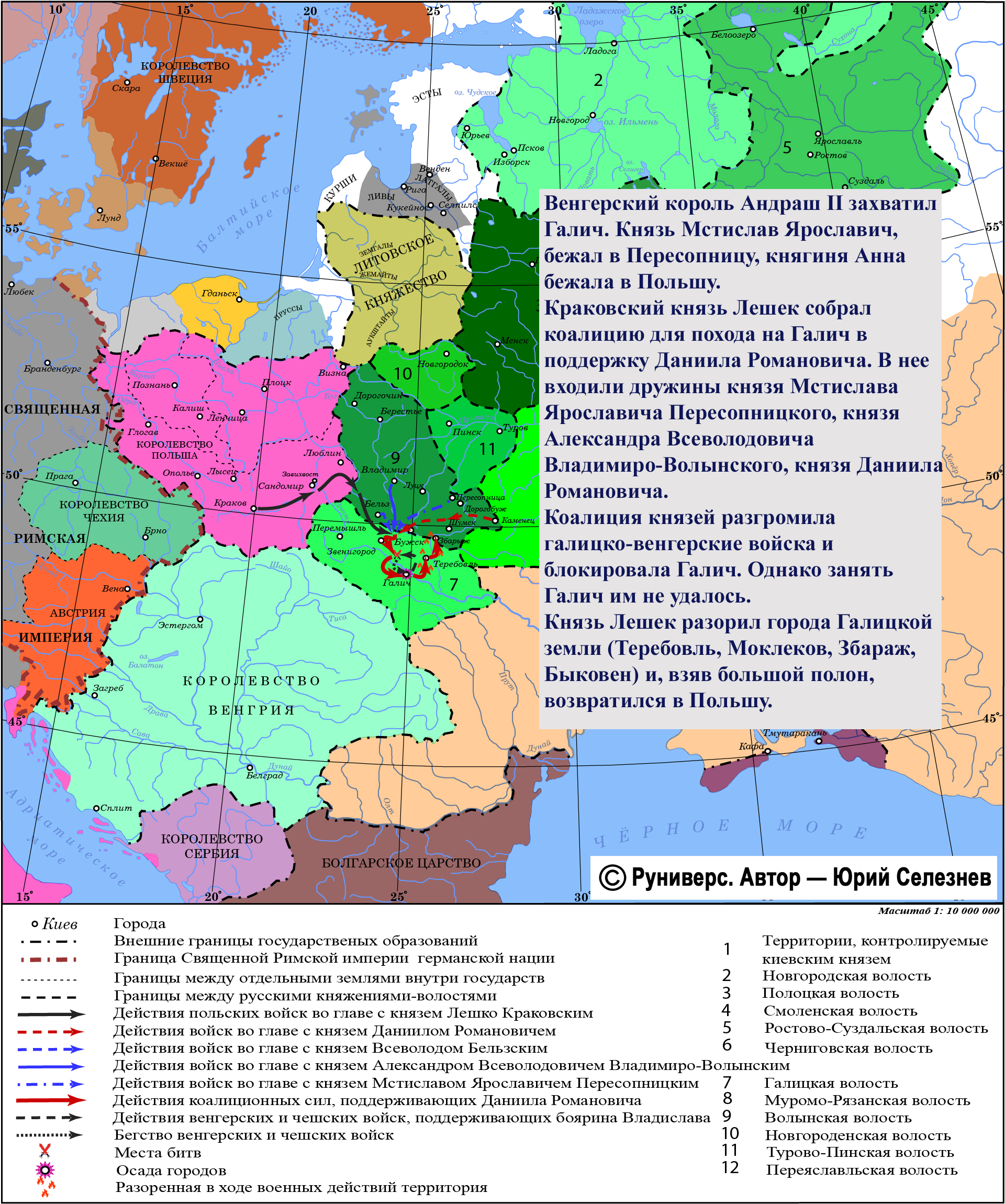 Венгерский король Андраш II поставил во главе своего войска захваченного им боярина Владислава Кормиличича и направил его на Галич. При его приближении князь Мстислав Ярославич бежал в Пересопницу. Княгиня Анна бежала в Польшу к князю Лешеку, откуда поехала с Даниилом в Каменец.