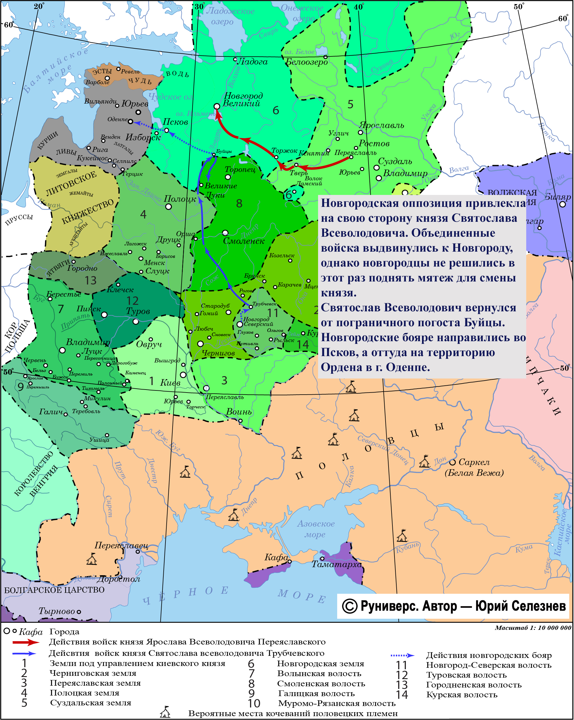 Новгородская оппозиция – бояре, которые укрылись в Чернигове от гонений князя Ярослава Всеволодовича, — привлекла на свою сторону князя Святослава Всеволодовича. Объединенные войска выдвинулись к Новгороду. Однако новгородцы не решились в этот раз поднять мятеж для смены князя. Святослав Всеволодович вернулся от пограничного погоста Буйцы. Новгородские бояре направились во Псков, а оттуда на территорию Ордена в г. Оденпе.