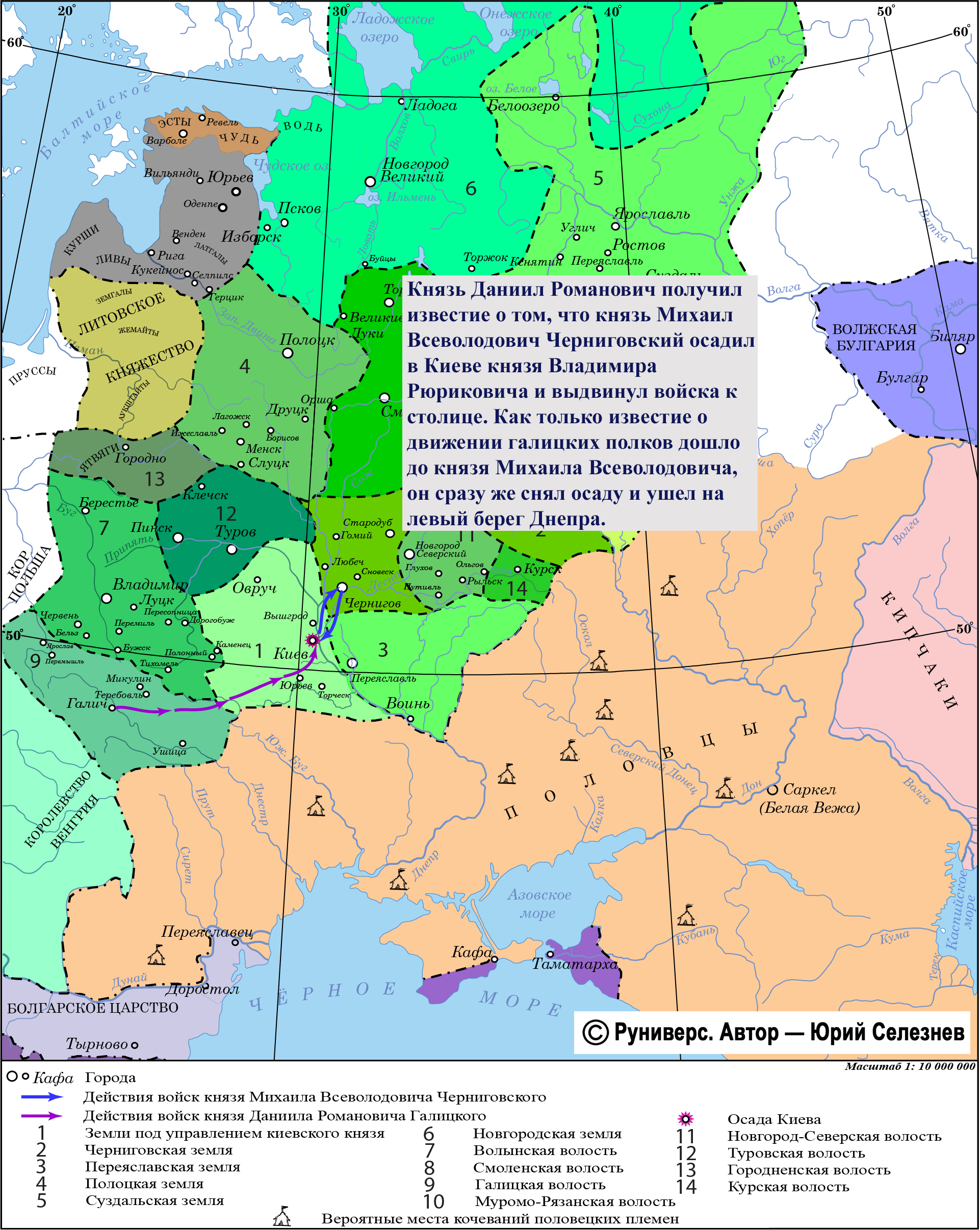 После занятия Галича князь Даниил Романович получил известие о том, что князь Михаил Всеволодович Черниговский осадил в Киеве князя Владимира Рюриковича. Князь Даниил выдвинул войска к столице. Как только известие о движении галицких полков дошло до князя Михаила Всеволодовича, он сразу же снял осаду и ушел на левый берег Днепра.
