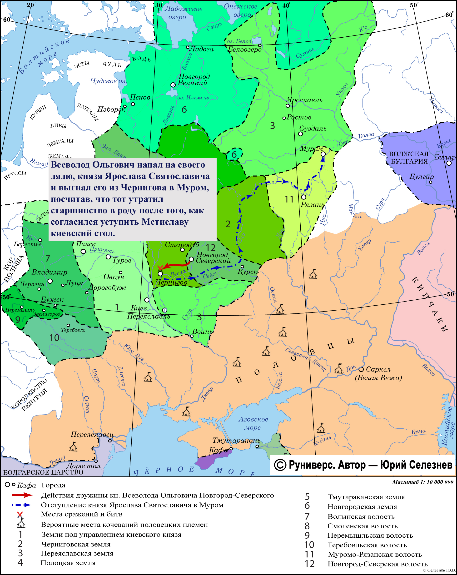 Всеволод Ольгович напал на своего дядю, князя Ярослава Святославича и выгнал его из Чернигова в Муром, посчитав, что тот утратил старшинство в роду после того, как согласился уступить Мстиславу киевский стол.