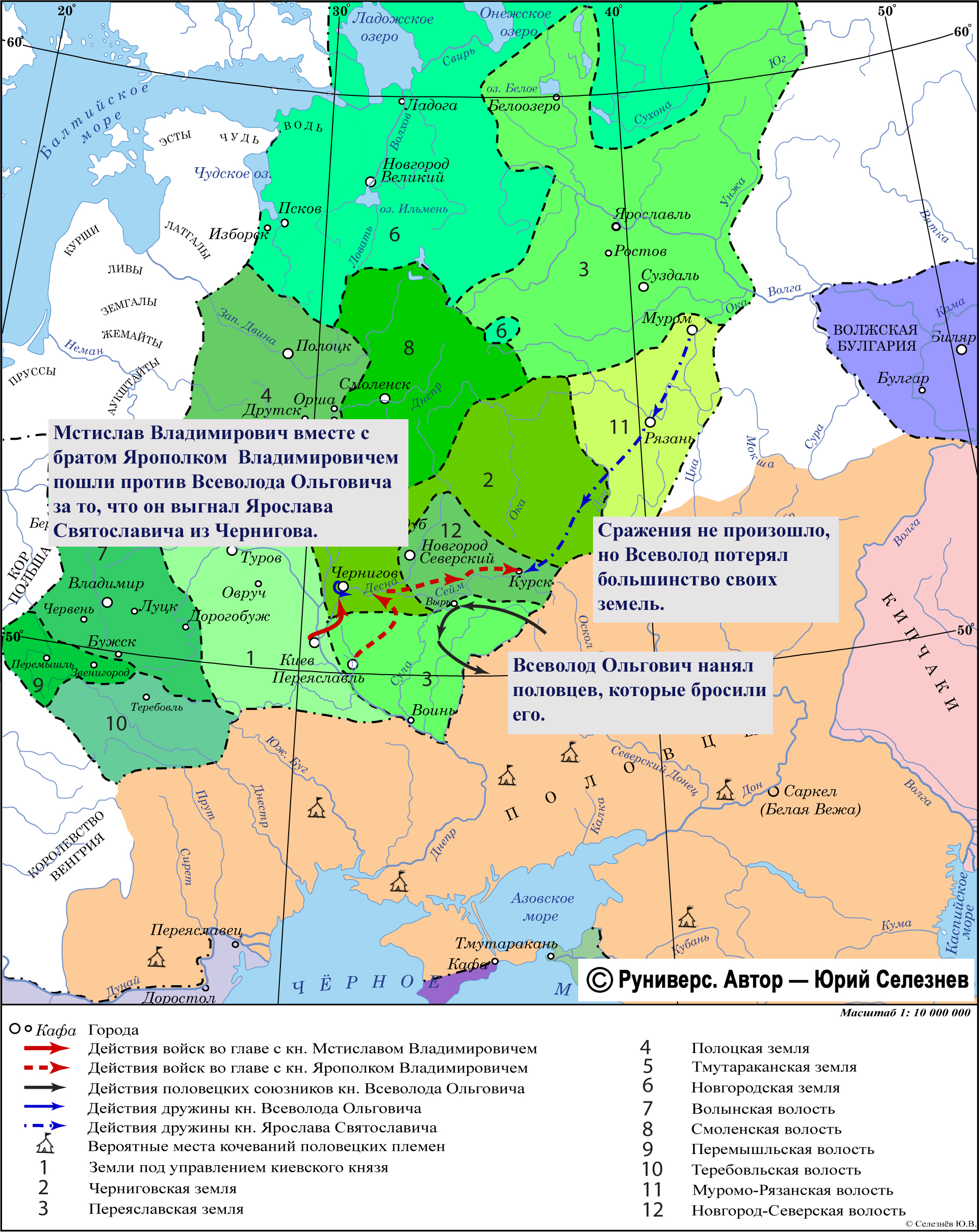 Мстислав Владимирович вместе с братом Ярополком Владимировичем пошли против Всеволода Ольговича за то, что он выгнал Ярослава Святославича из Чернигова. Всеволод Ольгович нанял половцев, которые бросили его. Сражения не произошло, но Всеволод потерял большинство своих земель.
