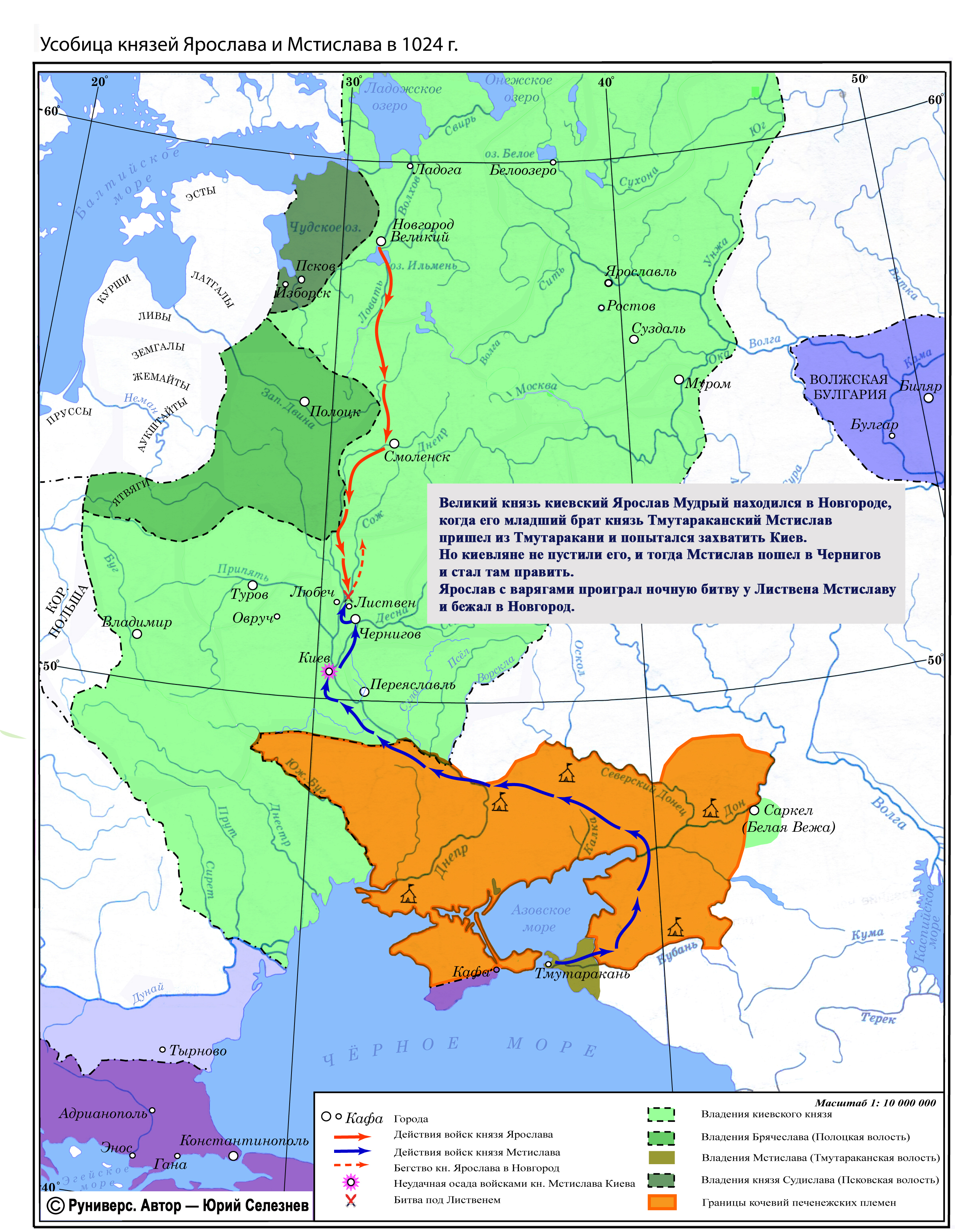 Великий князь киевский Ярослав Мудрый находился в Новгороде, когда его младший брат князь Тмутараканский Мстислав пришел из Тмутаракани и попытался захватить Киев, но киевляне не пустили его, и тогда Мстислав пошел в Чернигов и стал там править. Ярослав с варягами проиграл ночную битву у Листвена Мстиславу и бежал в Новгород.