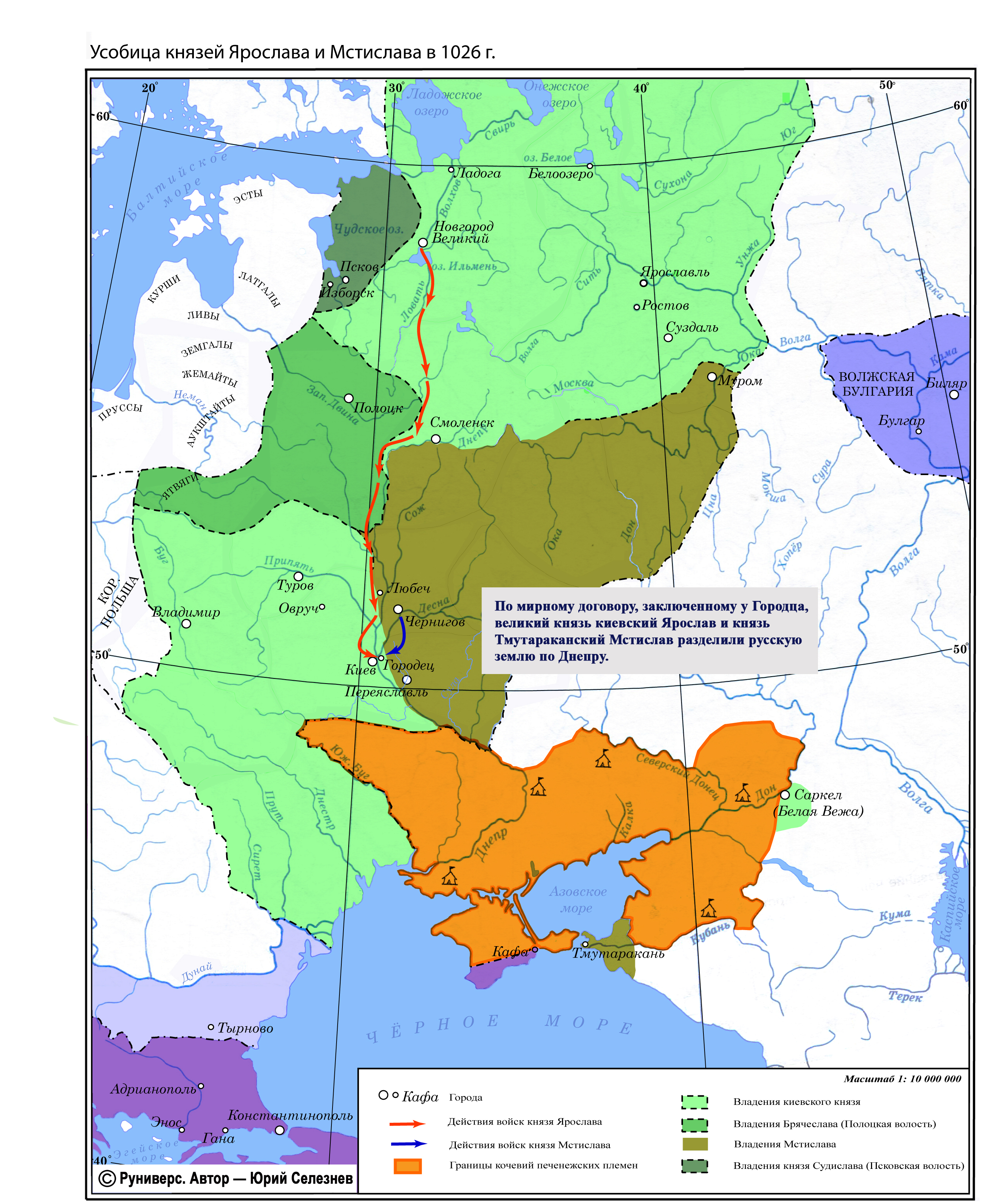 По мирному договору, заключенному у Городца, великий князь киевский Ярослав и князь Тмутараканский Мстислав разделили русскую землю по Днепру.