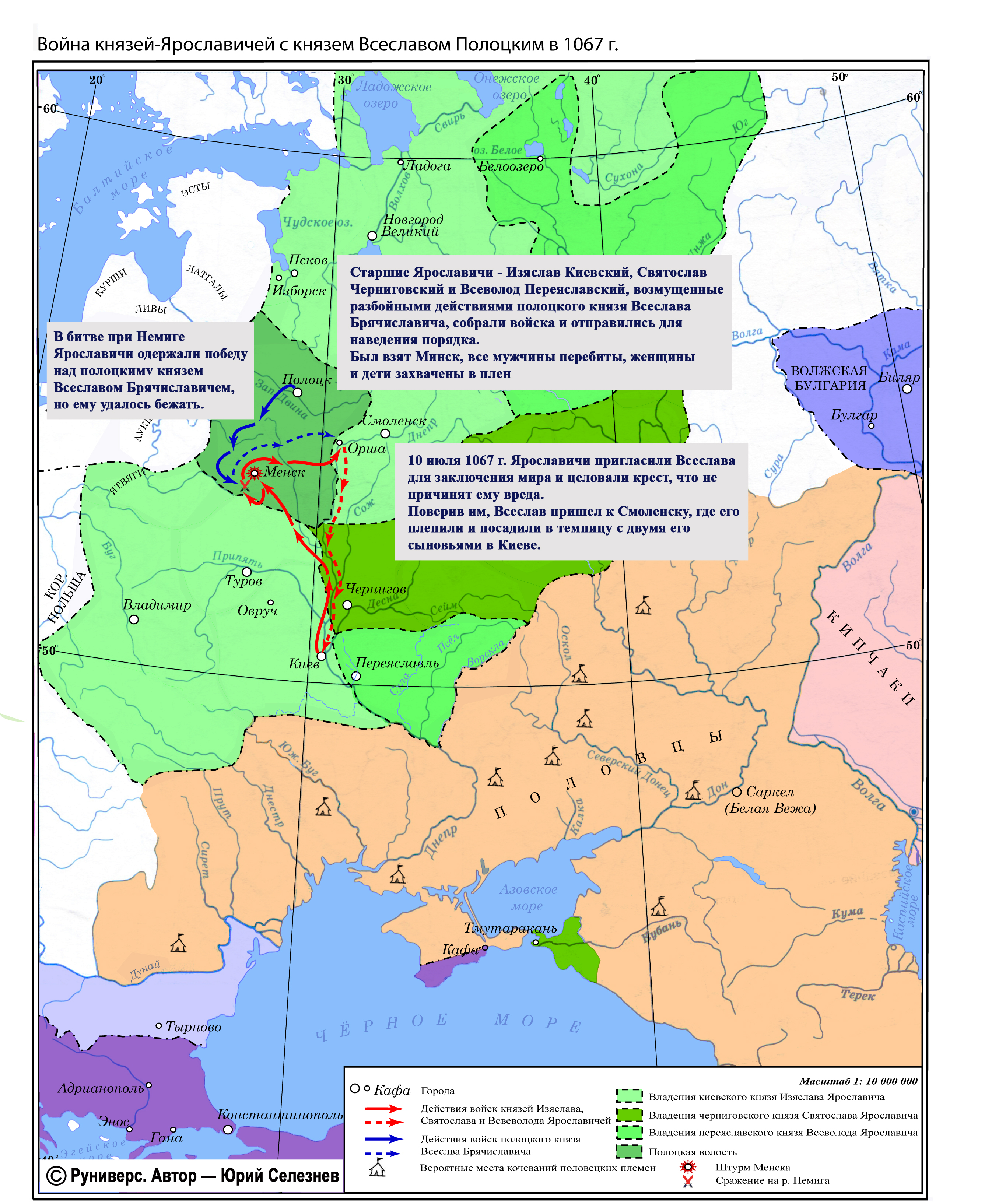 Старшие Ярославичи - Изяслав Киевский, Святослав Черниговский и Всеволод Переяславский, возмущенные разбойными действиями полоцкого князя Всеслава Брячиславича, собрали войска и отправились для наведения порядка.Был взят Минск, все мужчины перебиты, женщины и дети захвачены в плен