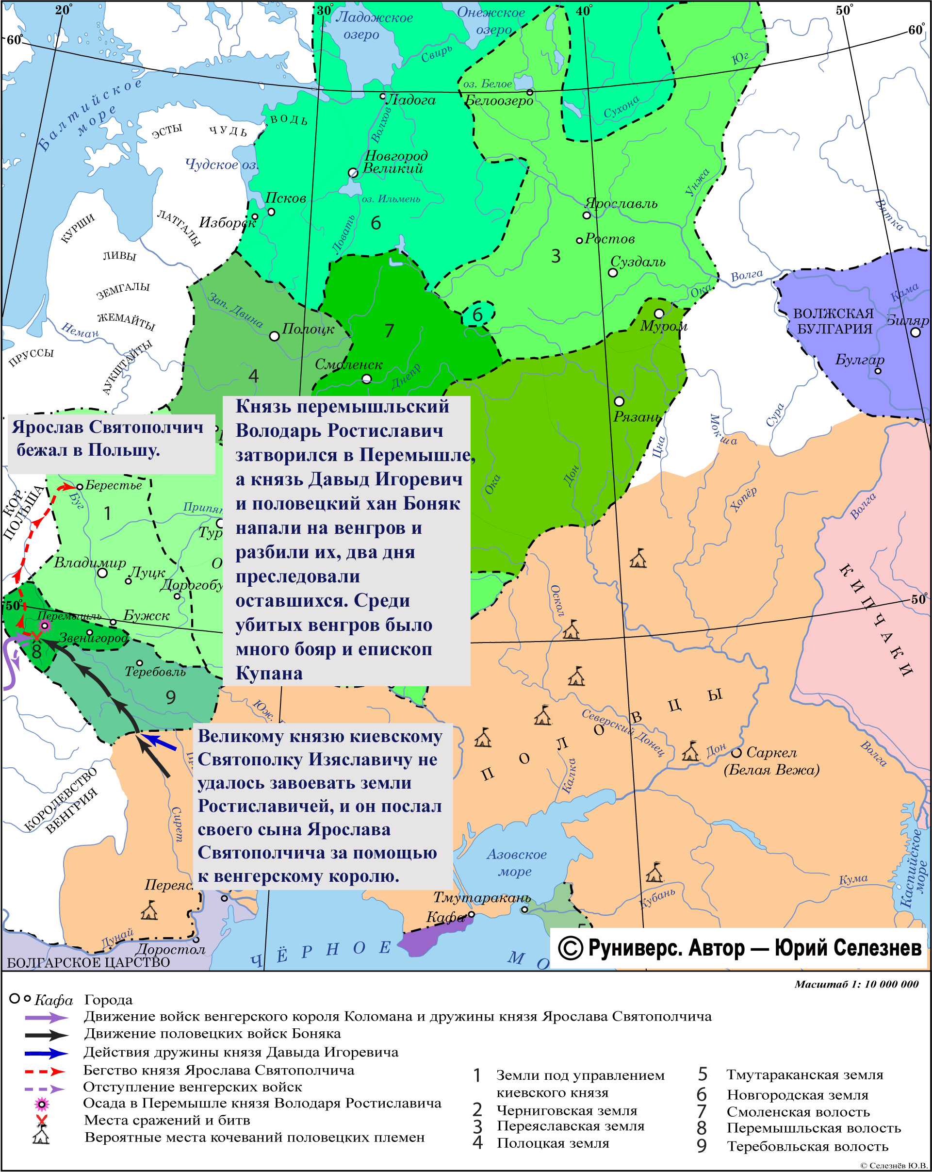 Великому князю киевскому Святополку Изяславичу не удалось завоевать земли Ростиславичей, и он послал своего сына Ярослава Святополчича за помощью к венгерскому королю. Князь перемышльский Володарь Ростиславич затворился в Перемышле, а князь Давыд Игоревич и половецкий хан Боняк напали на венгров и разбили их, два дня преследовали оставшихся. Среди убитых венгров было много бояр и епископ Купана. Ярослав Святополчич бежал в Польшу.