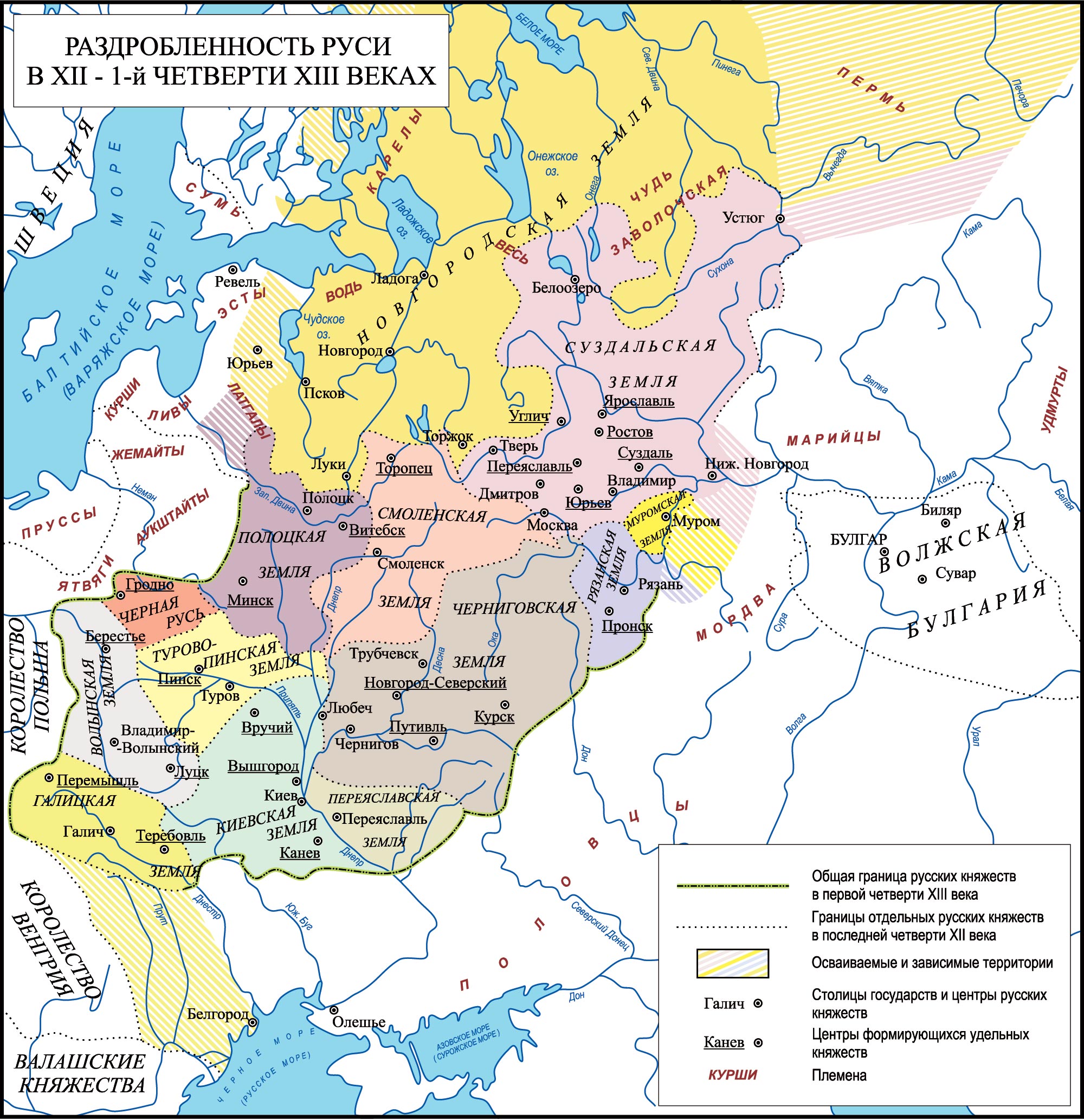 В XII столетии на Руси на основе волостей сложились тринадцать образований, начавших называться "землями". Девять из них (Полоцкая, Галицкая, Суздальская, Черниговская, Муромская, Рязанская, Смоленская, Волынская, Турово-Пинская) управлялись определенными ветвями княжеского рода Рюриковичей, а четыре земли (Киевская, Новгородская, Псковская и Переяславская) оспаривались представителями разных ветвей Рюриковичей. При этом Киевский стол номинально продолжал считаться "старейшим", а Киев — столицей всей Руси.