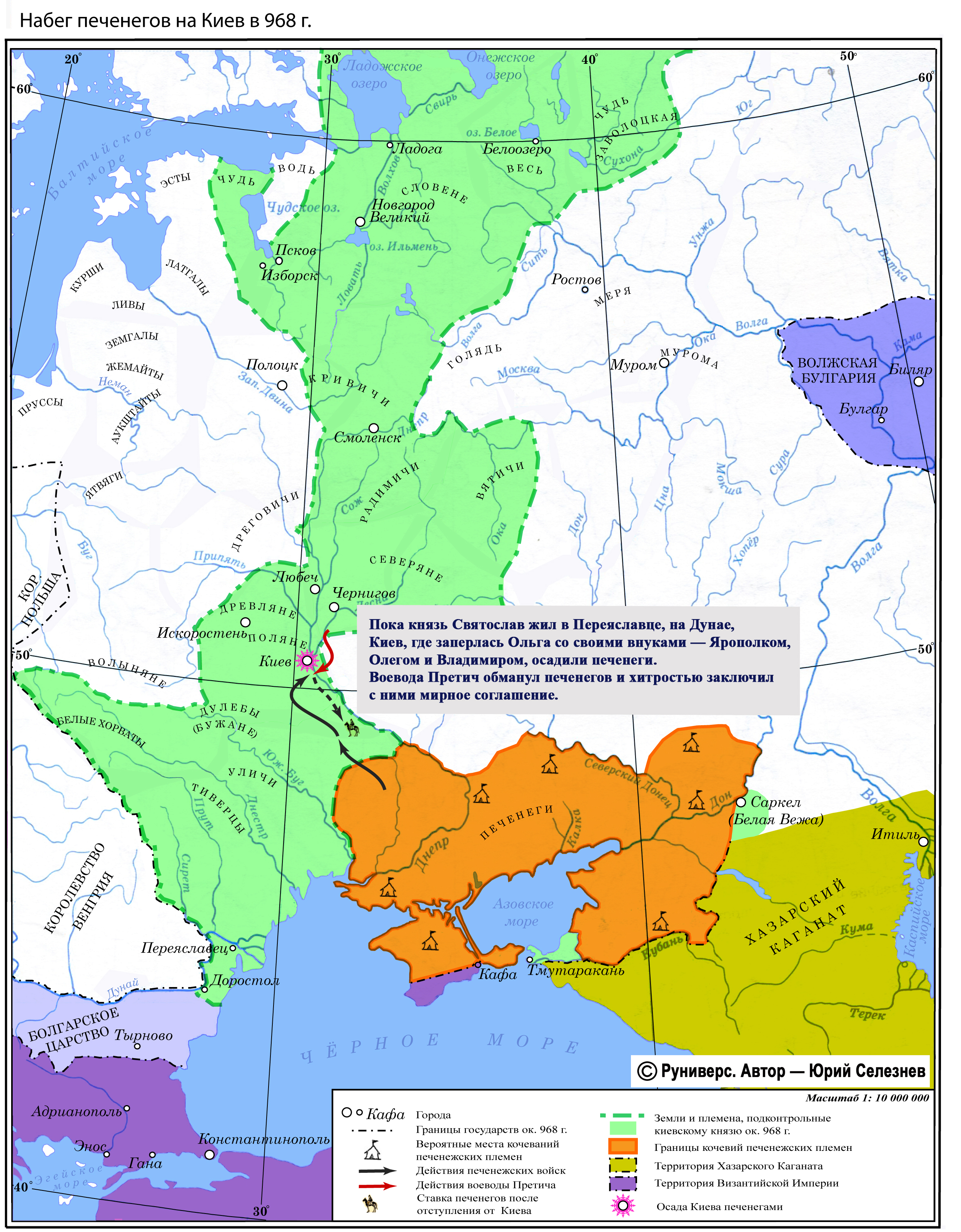 Пока князь Святослав жил в Переяславце на Дунае, Киев, где заперлась Ольга со своими внуками Ярополком, Олегом и Владимиром, осадили печенеги. Воевода Претич обманул печенегов и хитростью заключил с ними мирное соглашение.