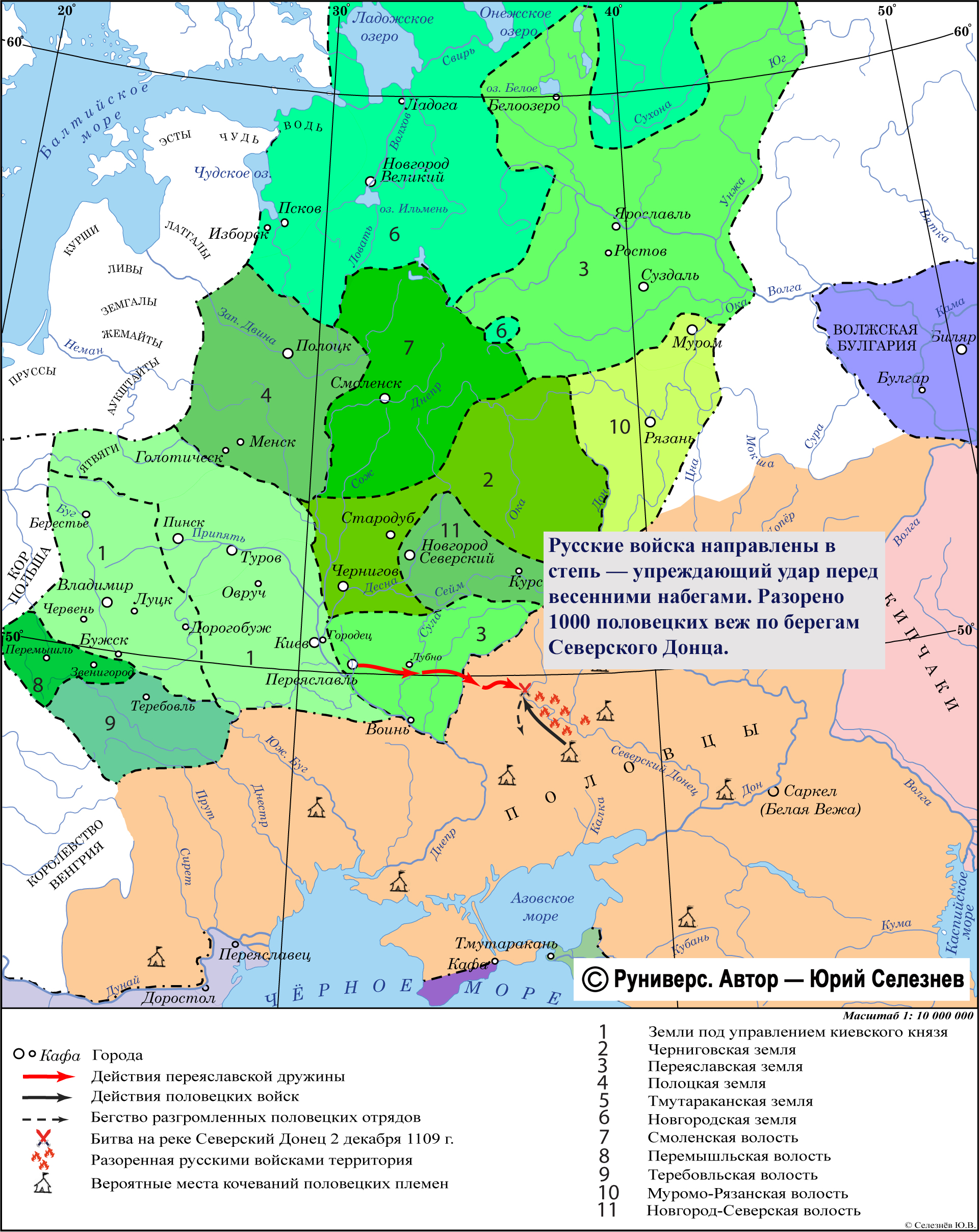 Русские войска направлены в степь — упреждающий удар перед весенними набегами. Разорено 1000 половецких веж по берегам Северского Донца.