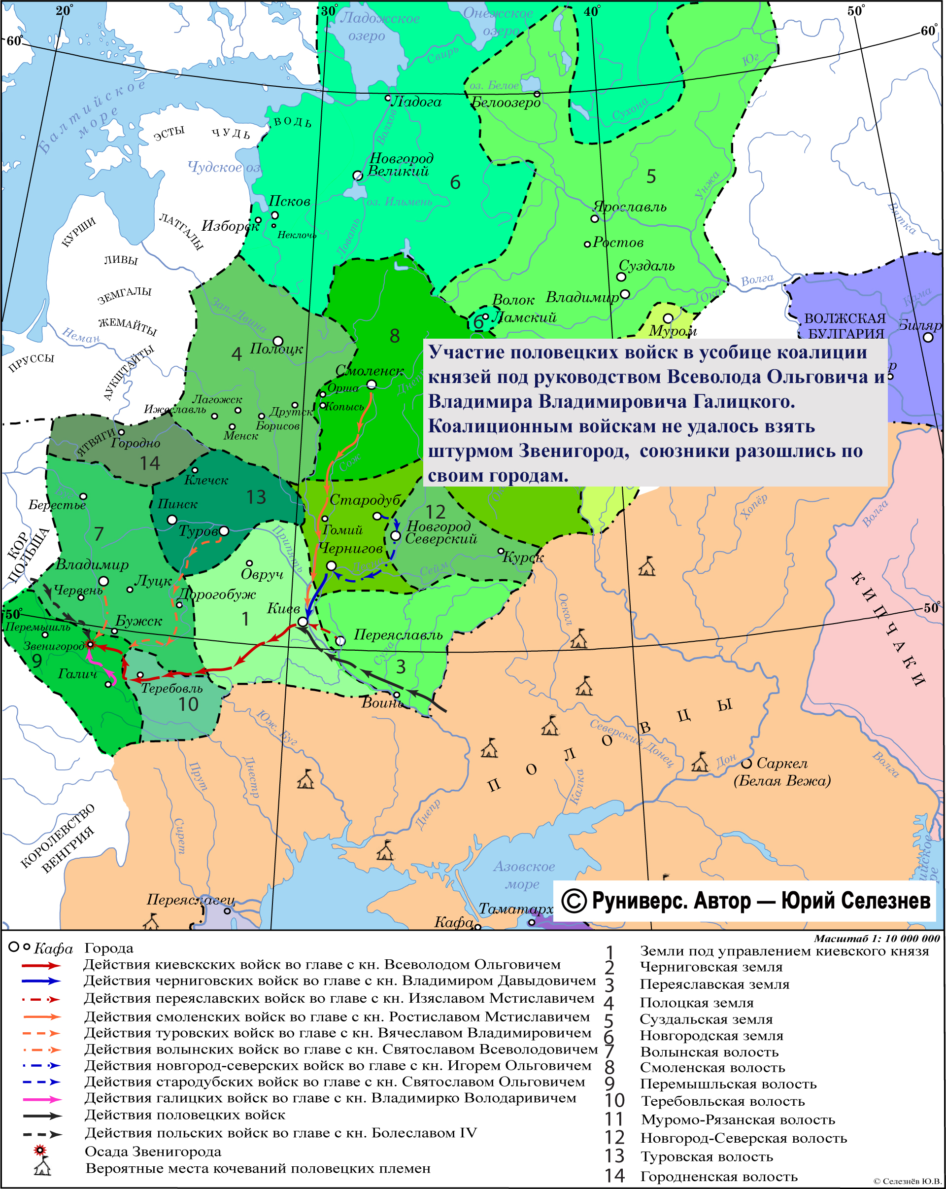 Участие половецких войск в усобице коалиции князей под руководством Всеволода Ольговича и Владимира Владимировича Галицкого. Коалиционным войскам не удалось взять штурмом Звенигород, союзники разошлись по своим городам