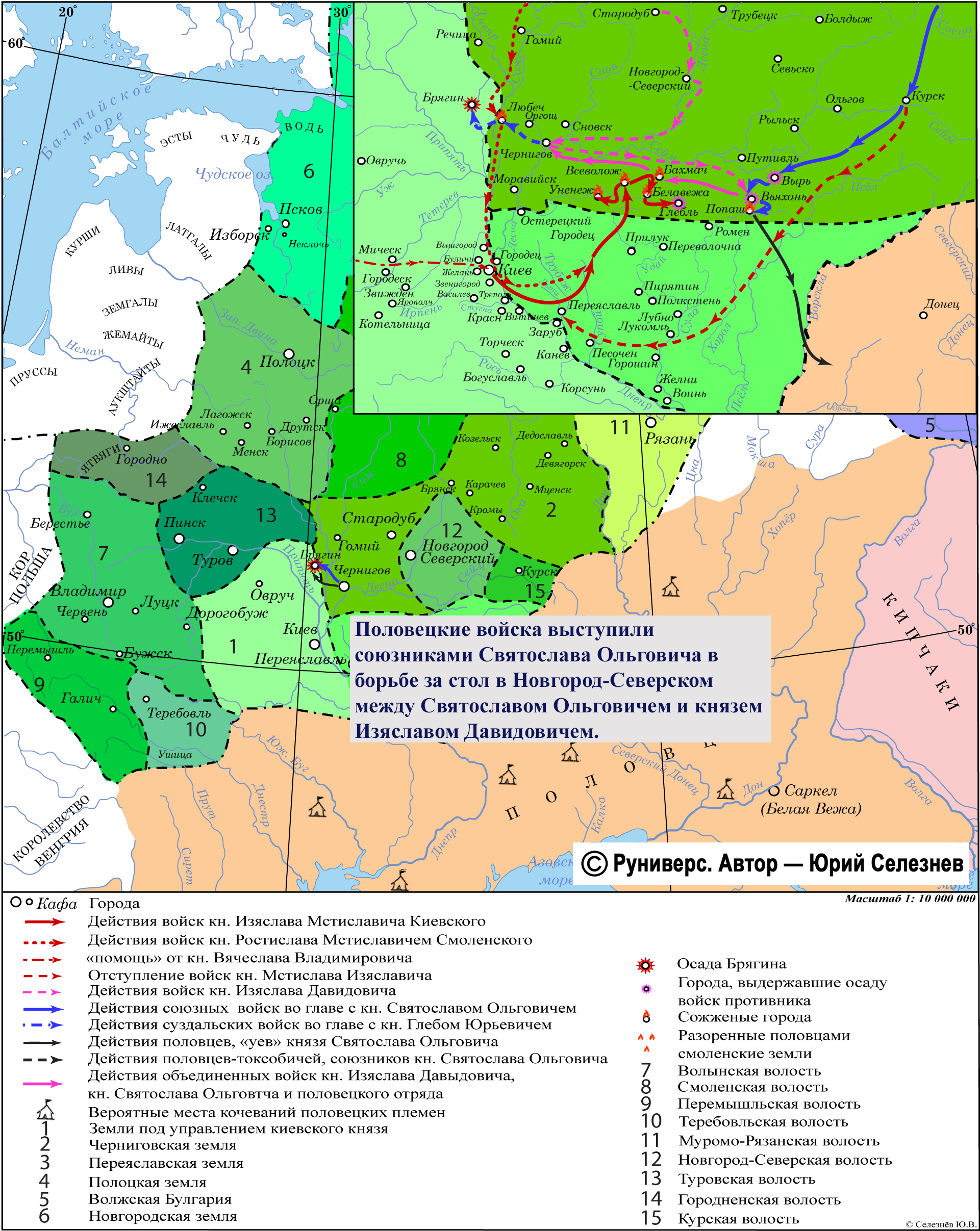 Половецкие войска выступили союзниками Святослава Ольговича в борьбе за стол в Новгород-Северском между Святославом Ольговичем и князем Изяславом Давидовичем.