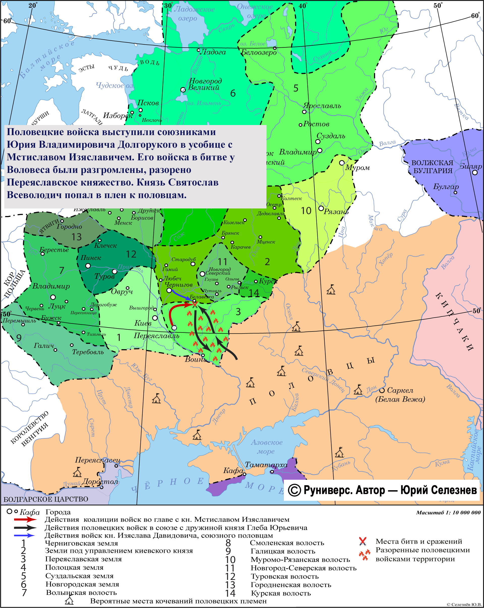 Половецкие войска выступили союзниками Юрия Владимировича Долгорукого в усобице с Мстиславом Изяславичем. Его войска в битве у Воловеса были разгромлены, разорено Переяславское княжество. Князь Святослав Всеволодич попал в плен к половцам.