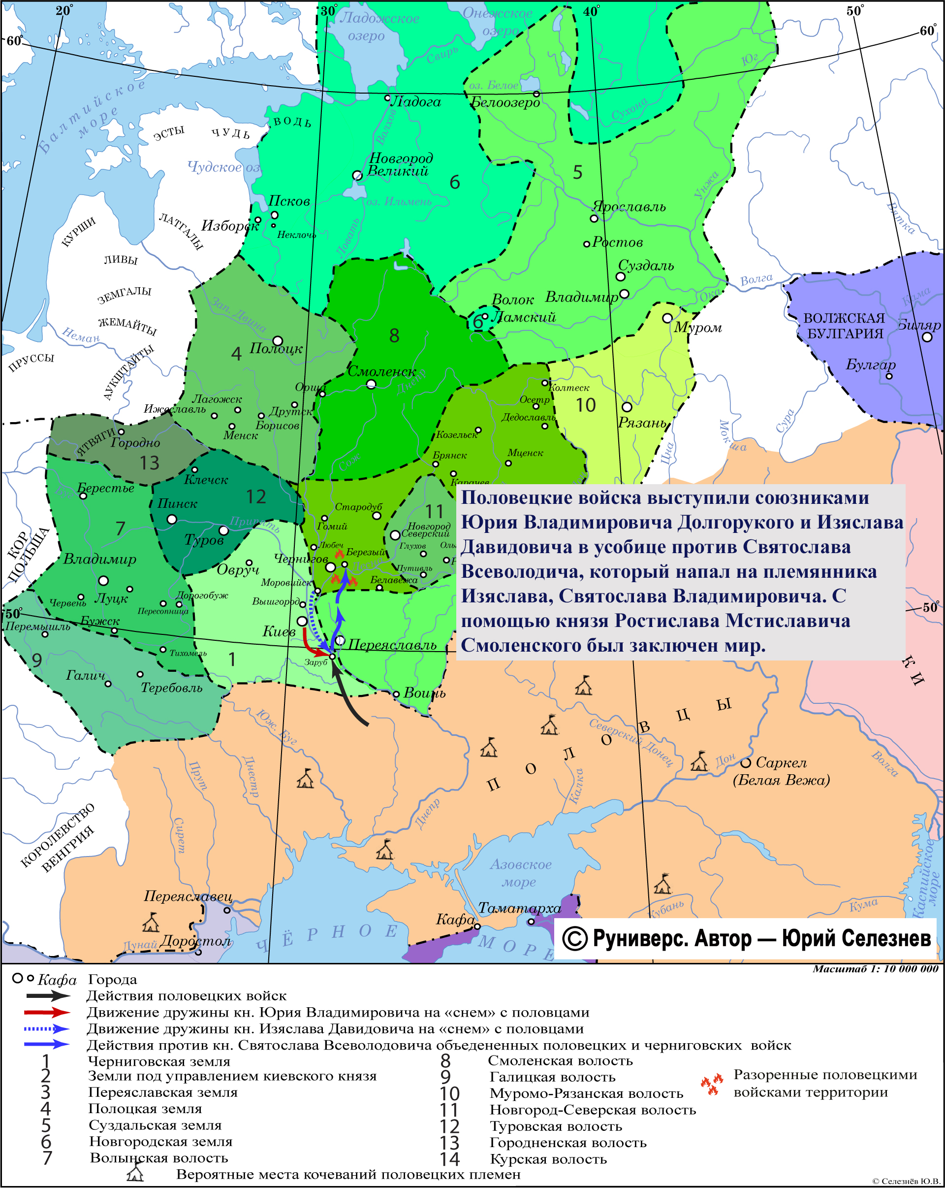 Половецкие войска выступили союзниками Юрия Владимировича Долгорукого и Изяслава Давидовича в усобице против Святослава Всеволодича, который напал на племянника Изяслава, Святослава Владимировича. С помощью князя Ростислава Мстиславича Cмоленского был заключен мир.
