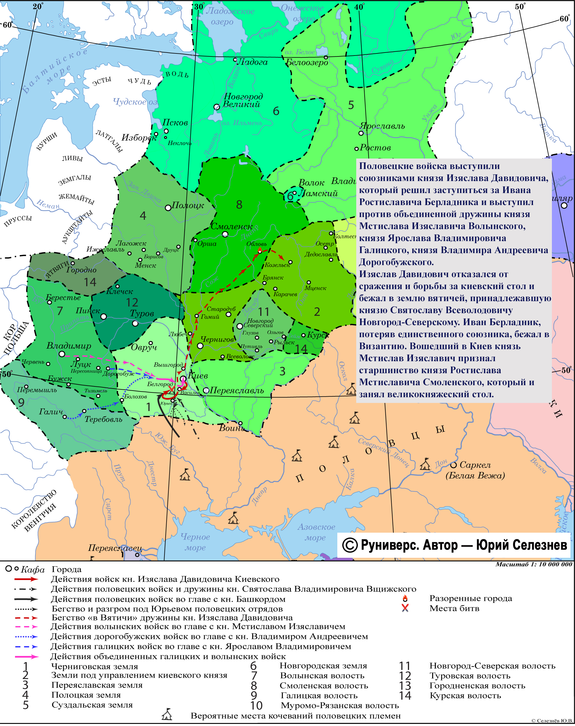 Половецкие войска выступили союзниками князя Изяслава Давидовича, который решил заступиться за Ивана Ростиславича Берладника и выступил против объединенной дружины князя Мстислава Изяславича Волынского, князя Ярослава Владимировича Галицкого, князя Владимира Андреевича Дорогобужского. Изяслав Давидович отказался от сражения и борьбы за киевский стол и бежал в землю вятичей, принадлежавшую князю Святославу Всеволодовичу Новгород-Северскому. Иван Берладник, потеряв единственного союзника, бежал в Византию. Вошедший в Киев князь Мстислав Изяславич признал старшинство князя Ростислава Мстиславича Смоленского, который и занял великокняжеский