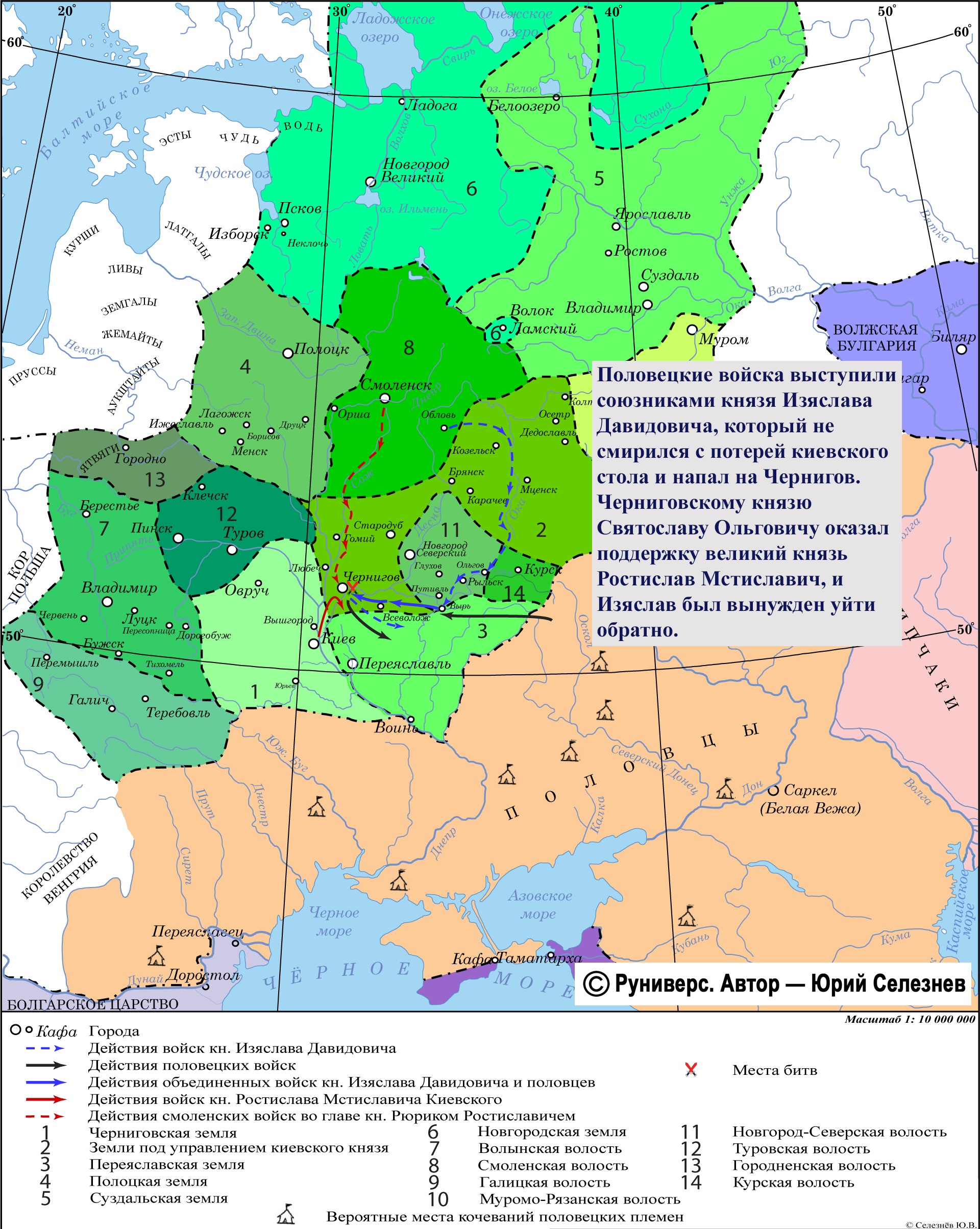 Половецкие войска выступили союзниками князя Изяслава Давидовича, который не смирился с потерей киевского стола и напал на Чернигов. Черниговскому князю Святославу Ольговичу оказал поддержку великий князь Ростислав Мстиславич, и Изяслав был вынужден уйти обратно.