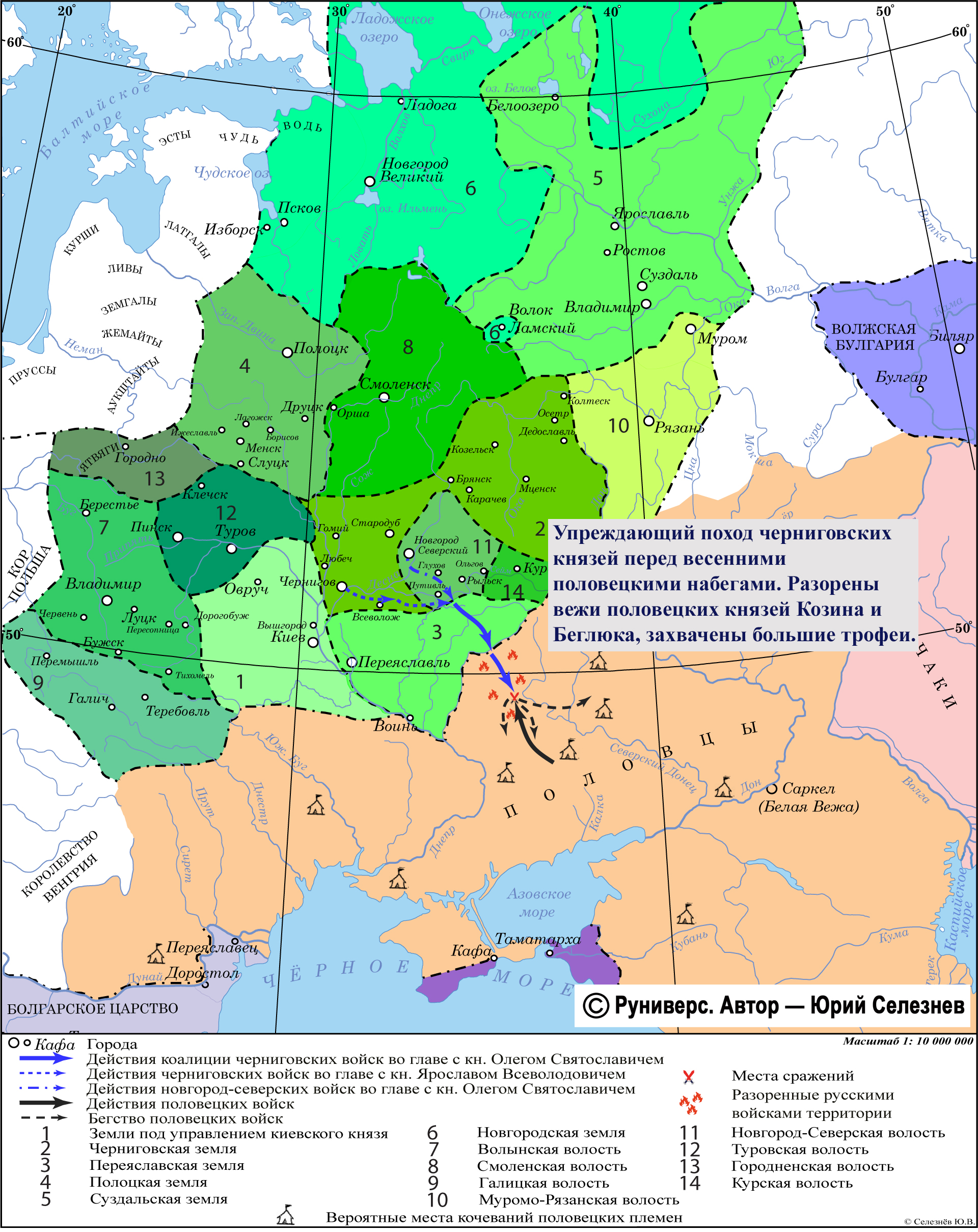 Упреждающий поход черниговских князей перед весенними половецкими набегами. Разорены вежи половецких князей Козина и Беглюка, захвачены большие трофеи.