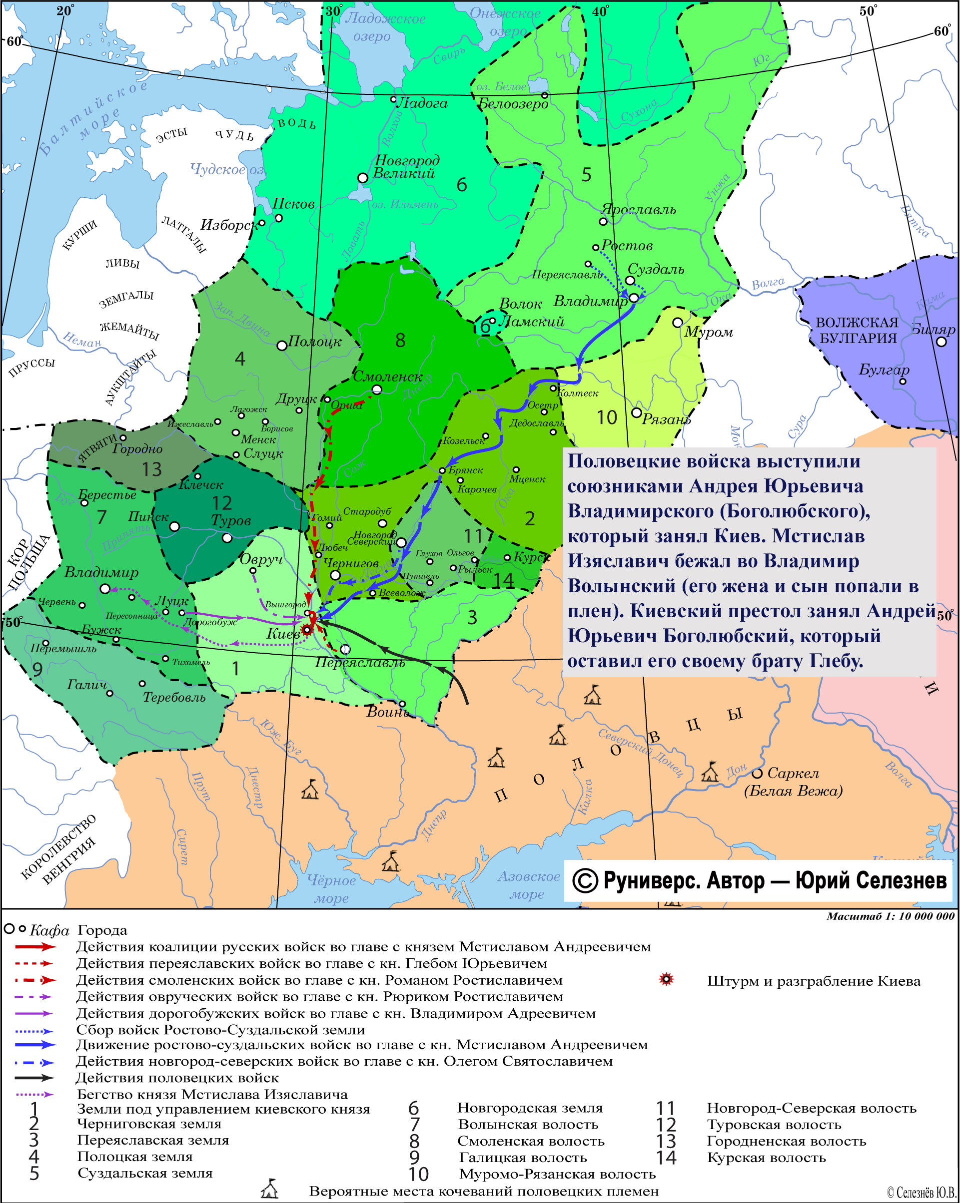 Половецкие войска выступили союзниками Андрея Юрьевича Владимирского (Боголюбского), который занял Киев. Мстислав Изяславич бежал во Владимир Волынский (его жена и сын попали в плен). Киевский престол занял Андрей Юрьевич Боголюбский, который оставил его своему брату Глебу.