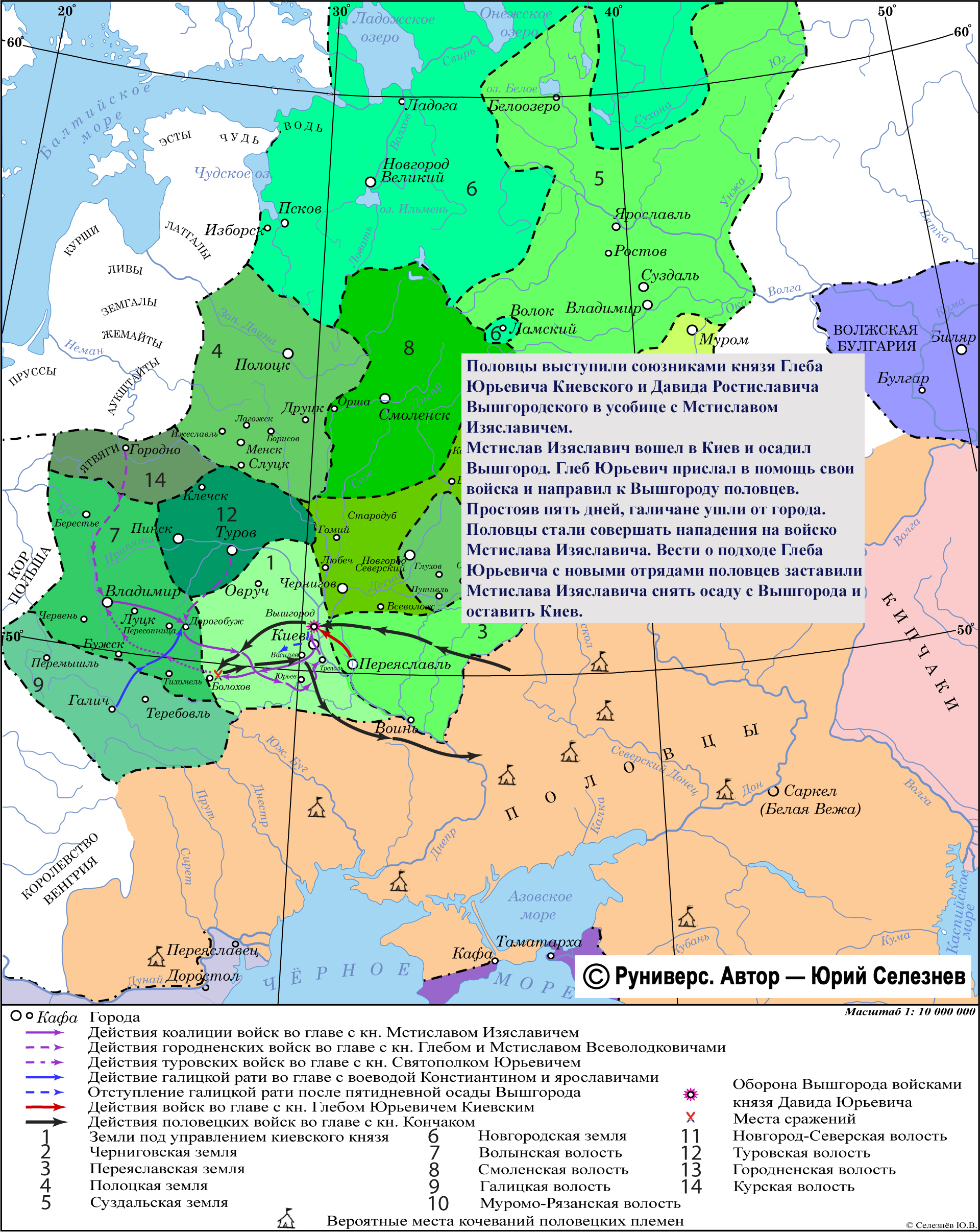 Половцы выступили союзниками князя Глеба Юрьевича Киевского и Давида Ростиславича Вышгородского в усобице с Мстиславом Изяславичем.