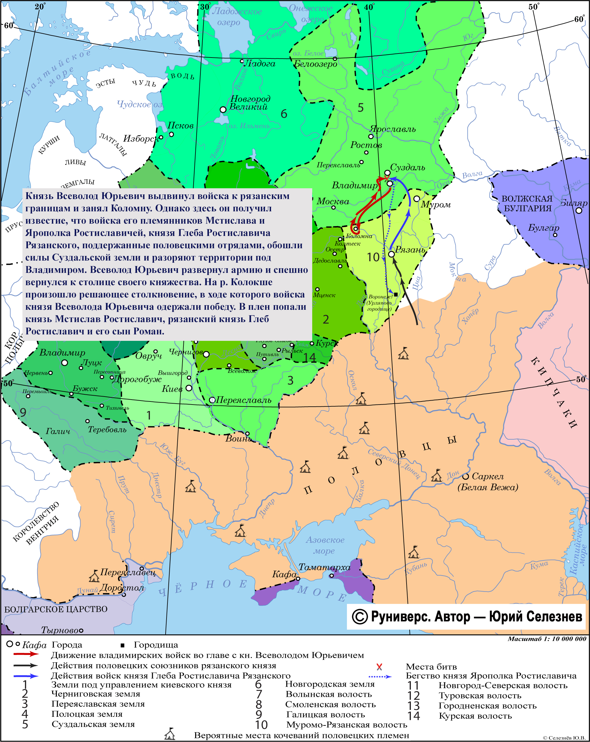 Князь Всеволод Юрьевич выдвинул войска к рязанским границам и занял Коломну. Однако здесь он получил известие, что войска его племянников Мстислава и Ярополка Ростиславичей, князя Глеба Ростиславича Рязанского, поддержанные половецкими отрядами, обошли силы Суздальской земли и разоряют территории под Владимиром. Всеволод Юрьевич развернул армию и спешно вернулся к столице своего княжества. На р. Колокше произошло решающее столкновение, в ходе которого войска князя Всеволода Юрьевича одержали победу. В плен попали князь Мстислав Ростиславич, рязанский князь Глеб Ростиславич и его сын Роман.