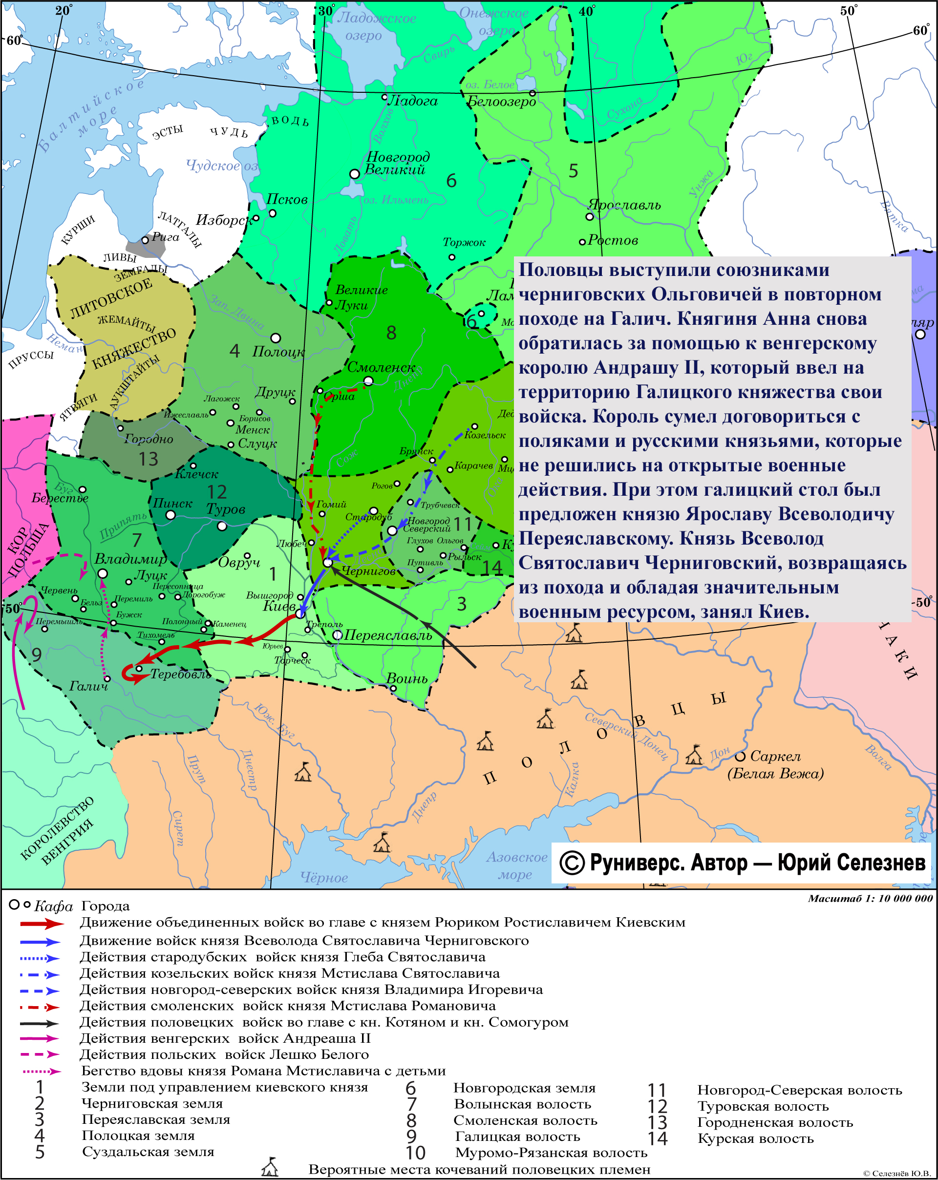 Половцы выступили союзниками черниговских Ольговичей в повторном походе на Галич. Княгиня Анна снова обратилась за помощью к венгерскому королю Андрашу II, который ввел на территорию Галицкого княжества свои войска. Король сумел договориться с поляками и русскими князьями, которые не решились на открытые военные действия. При этом галицкий стол был предложен князю Ярославу Всеволодичу Переяславскому. Князь Всеволод Святославич Черниговский, возвращаясь из похода и обладая значительным военным ресурсом, занял Киев.