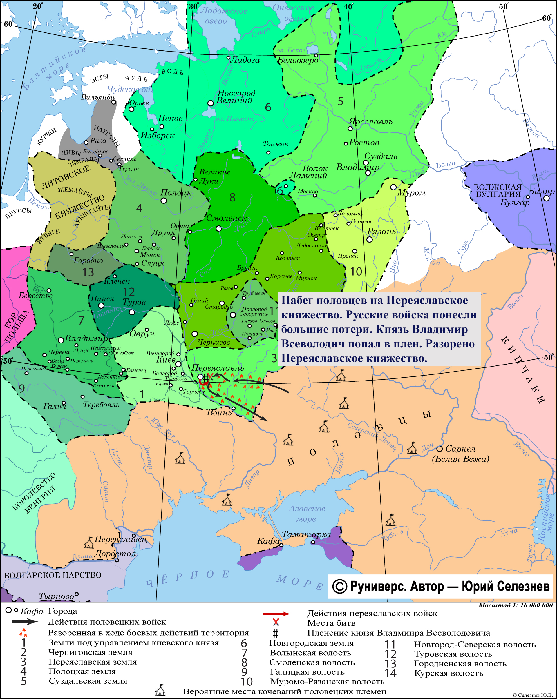 Набег половцев на Переяславское княжество. Русские войска понесли большие потери. Князь Владимир Всеволодич попал в плен. Разорено Переяславское княжество.