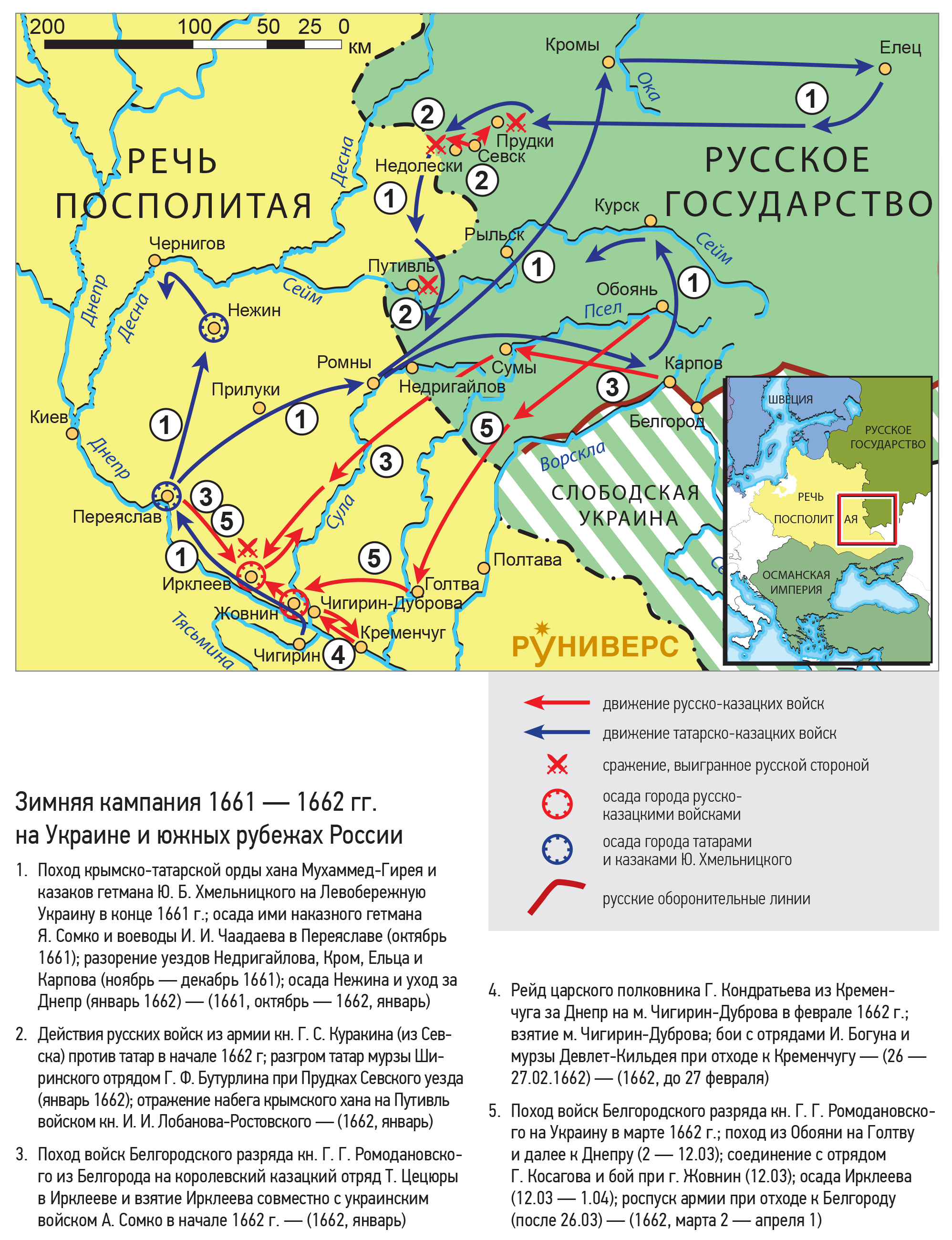 1. Поход крымско-татарской орды хана Мухаммед-Гирея и казаков гетмана Ю. Б. Хмельницкого на Левобережную Украину в конце 1661 г.; осада ими наказного гетмана Я. Сомко и воеводы И. И. Чаадаева в Переяславе (октябрь 1661); разорение уездов Недригайлова, Кром, Ельца и Карпова (ноябрь — декабрь 1661); осада Нежина и уход за Днепр (январь 1662) — (1661, октябрь — 1662, январь)